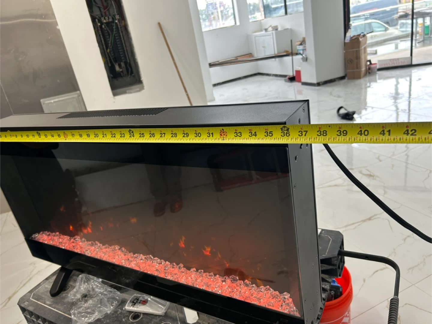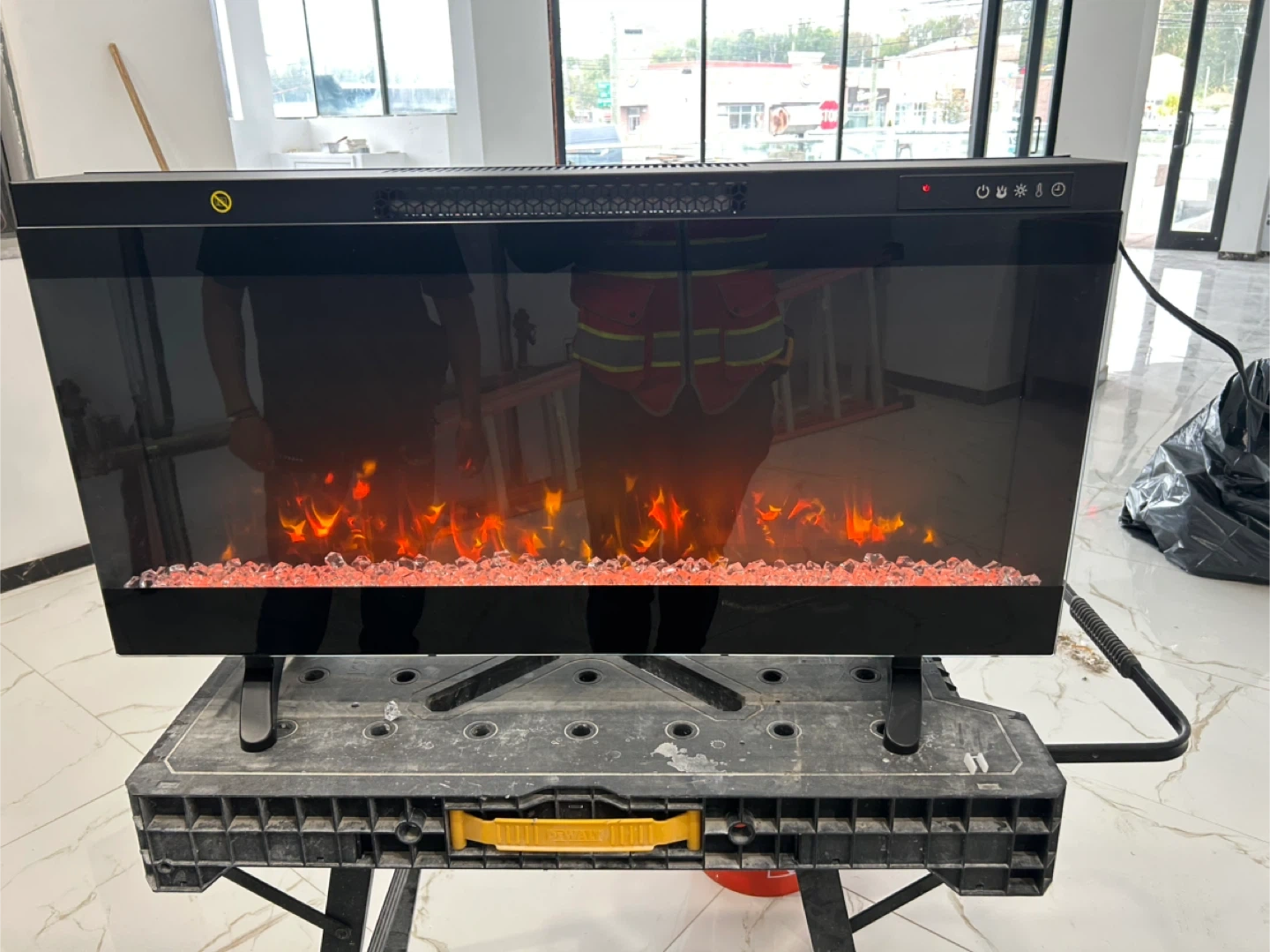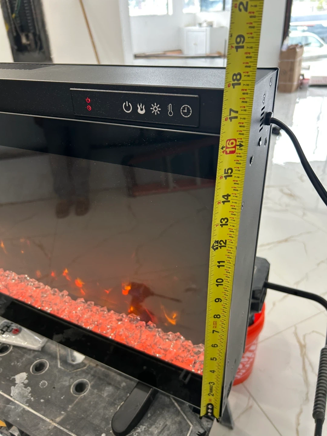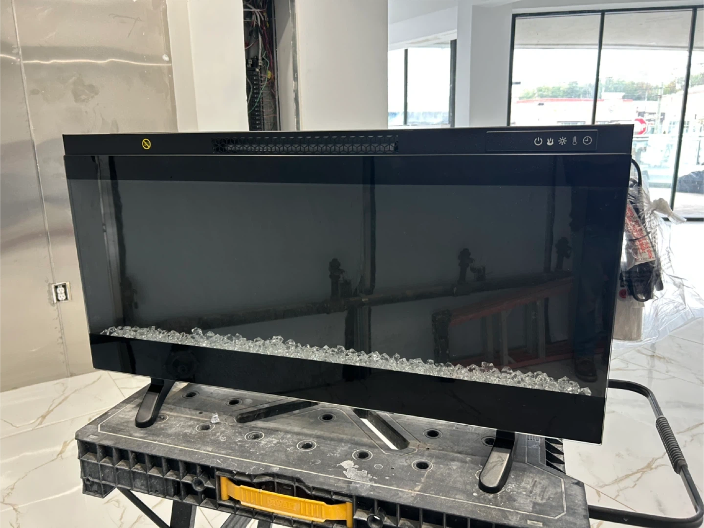 Selling an electric fireplace. It comes with a remote control. The fireplace has a black frame and a glass front with decorative crystals at the bottom. It can display different colors of flames.