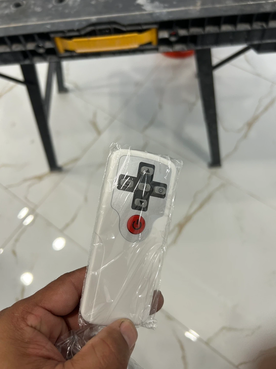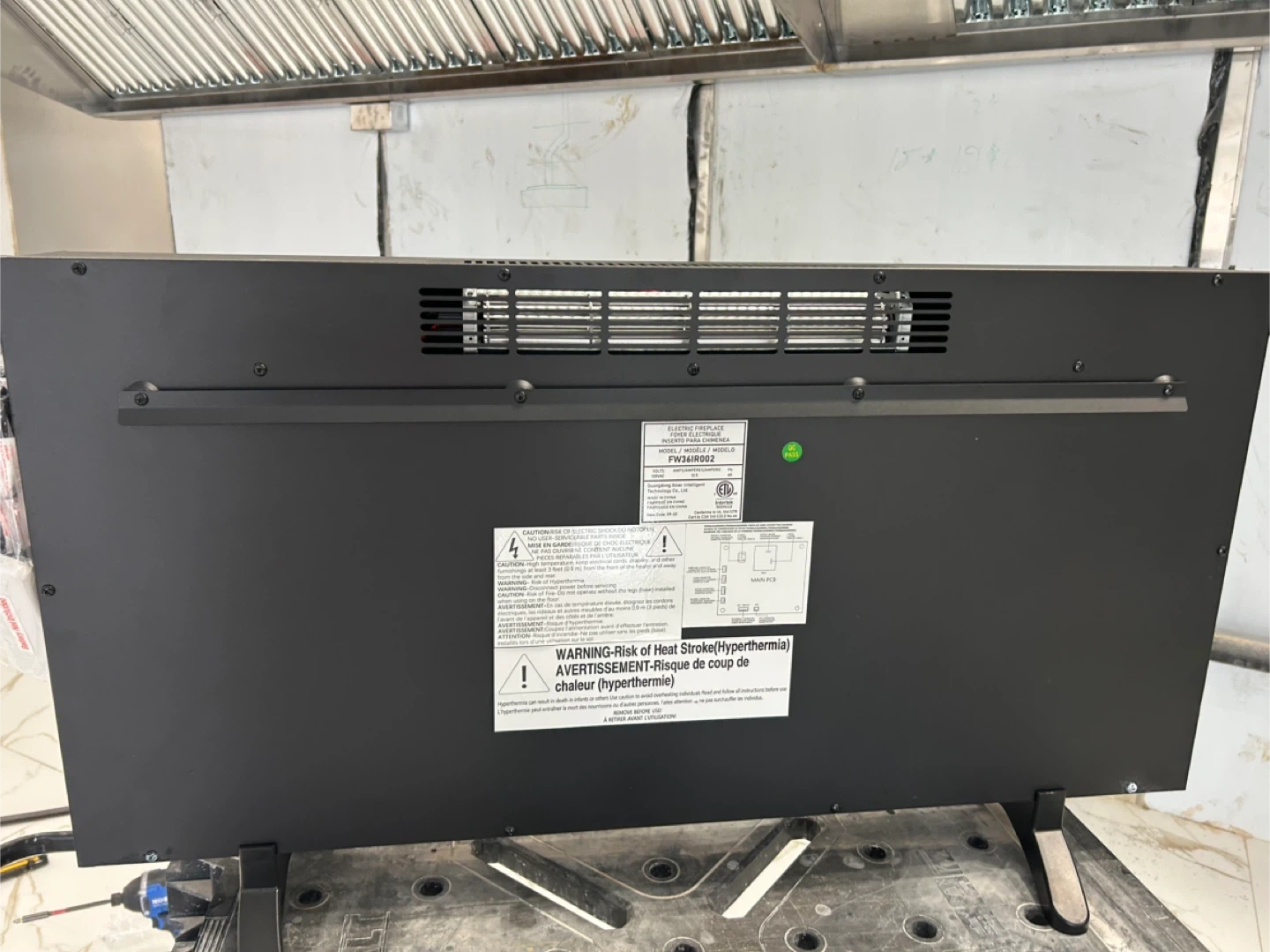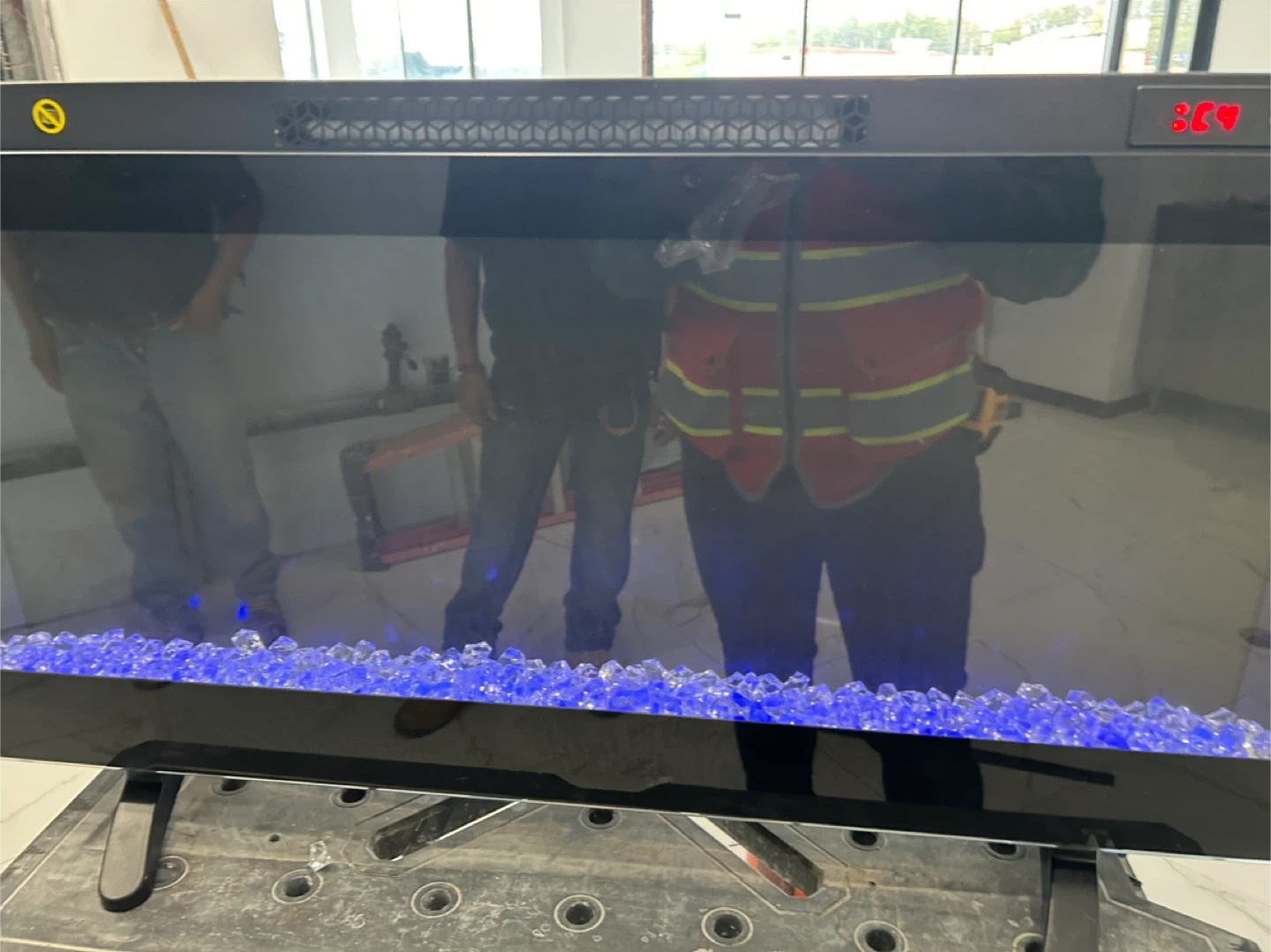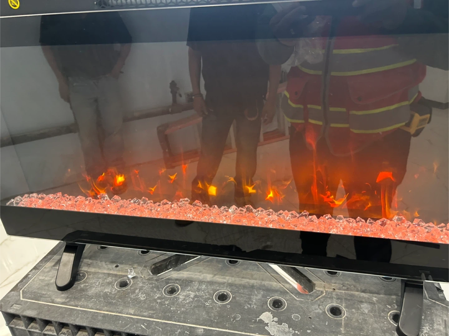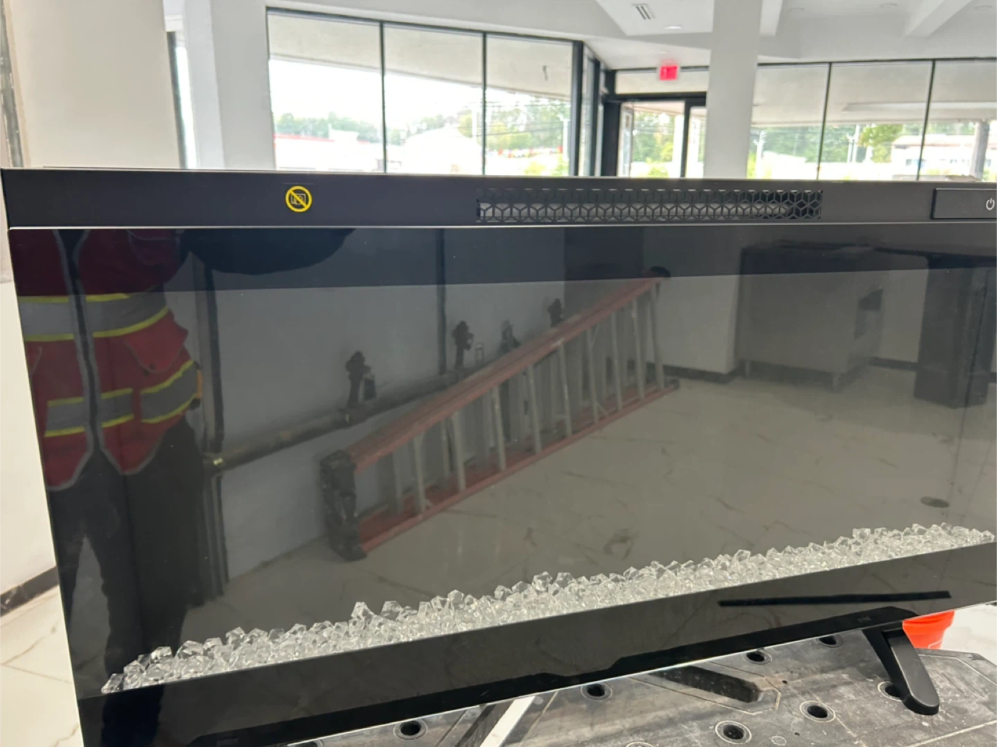Selling an electric fireplace. It comes with a remote control. The fireplace has a black frame and a glass front with decorative crystals at the bottom. It can display different colors of flames.