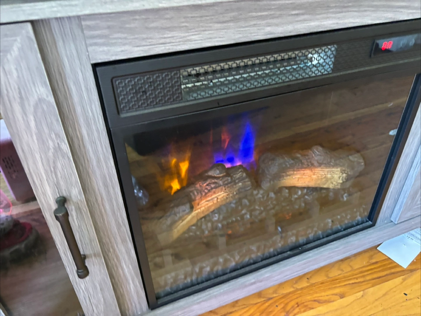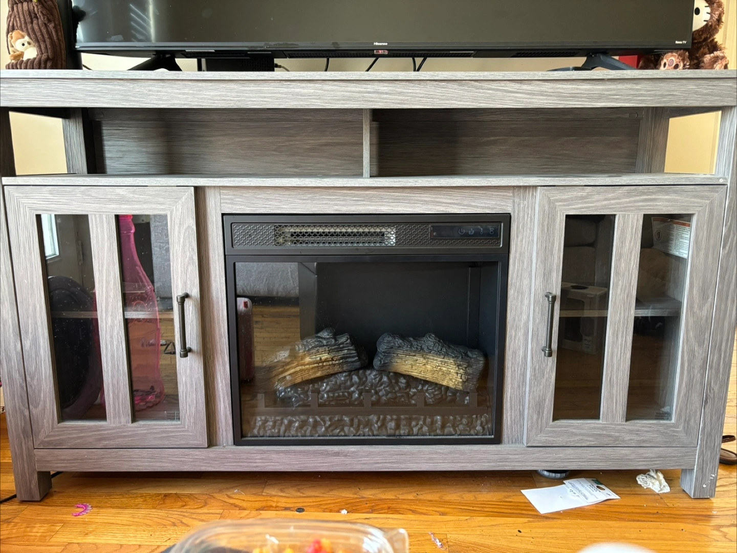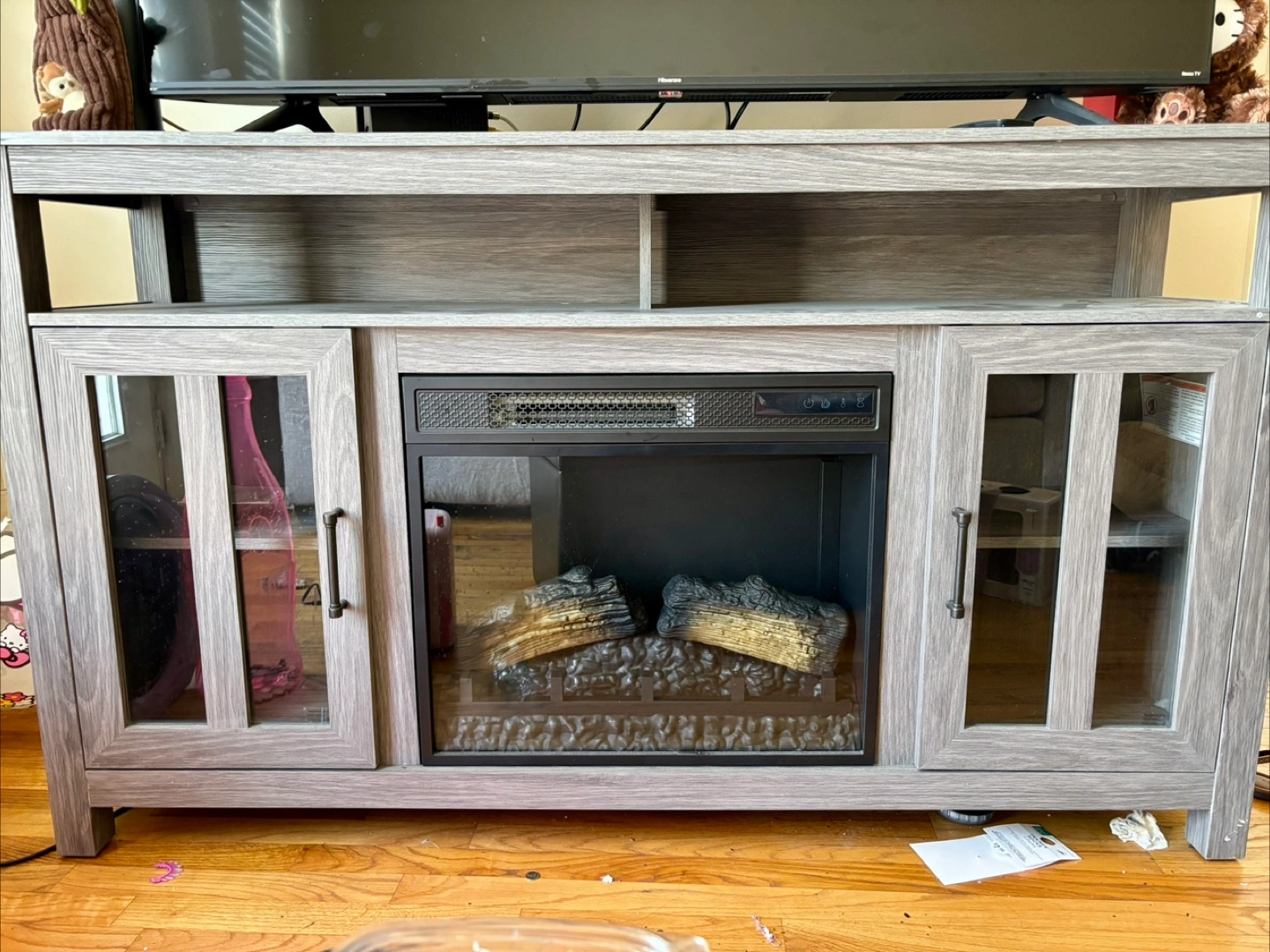 Gray wood-look media console. Features an electric fireplace, two glass-front cabinets, and an open shelf. Perfect for living room or family room. comes with remote. minor scratches and damages