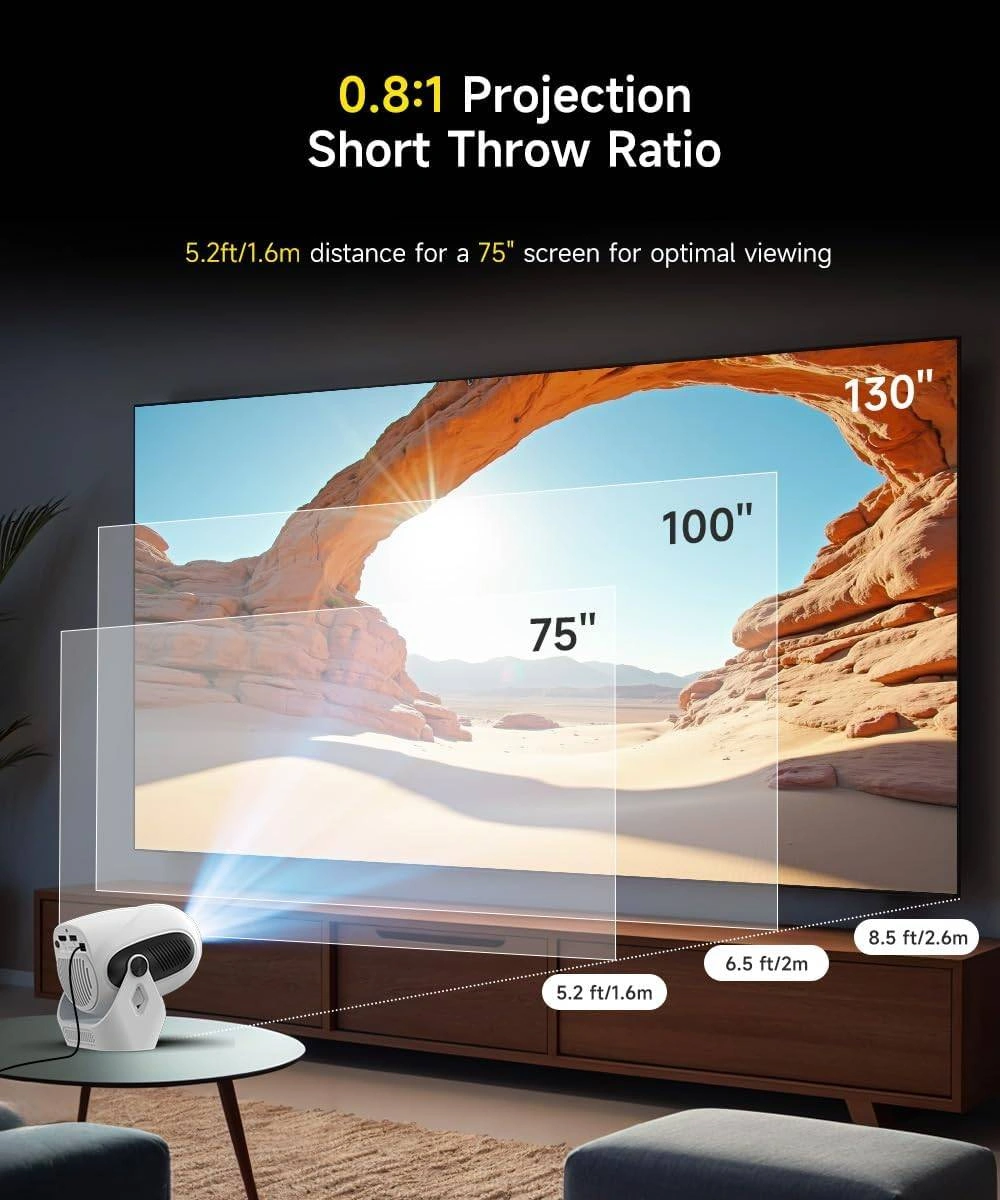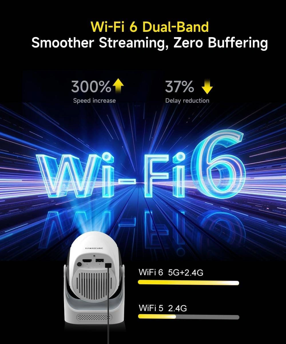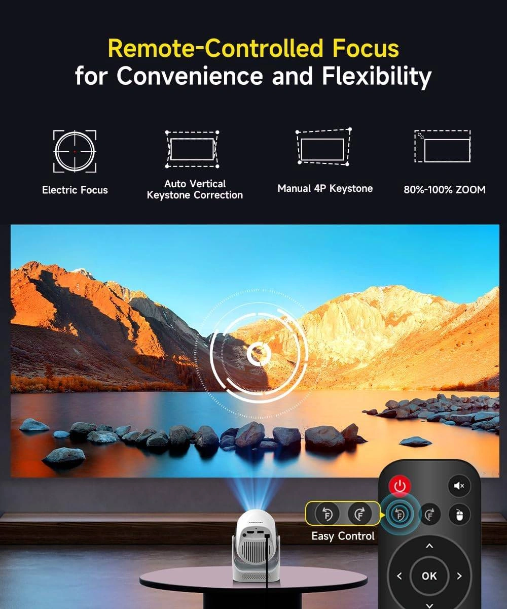 Compact, lightweight projector with electric focus, native 720P resolution, and 4K support. Features WiFi 6, Bluetooth 5.0, and Android 11 with 5000+ apps for seamless streaming. Auto vertical keystone ensures perfect visuals for home theater or outdoor movies. #Projector #ElectricFocus #WiFi6 #Bluetooth5.0 #720P #4KSupport #Android11 #HomeTheater #PortableProjector #SmartProjector #AutoKeystone #MovieNight
