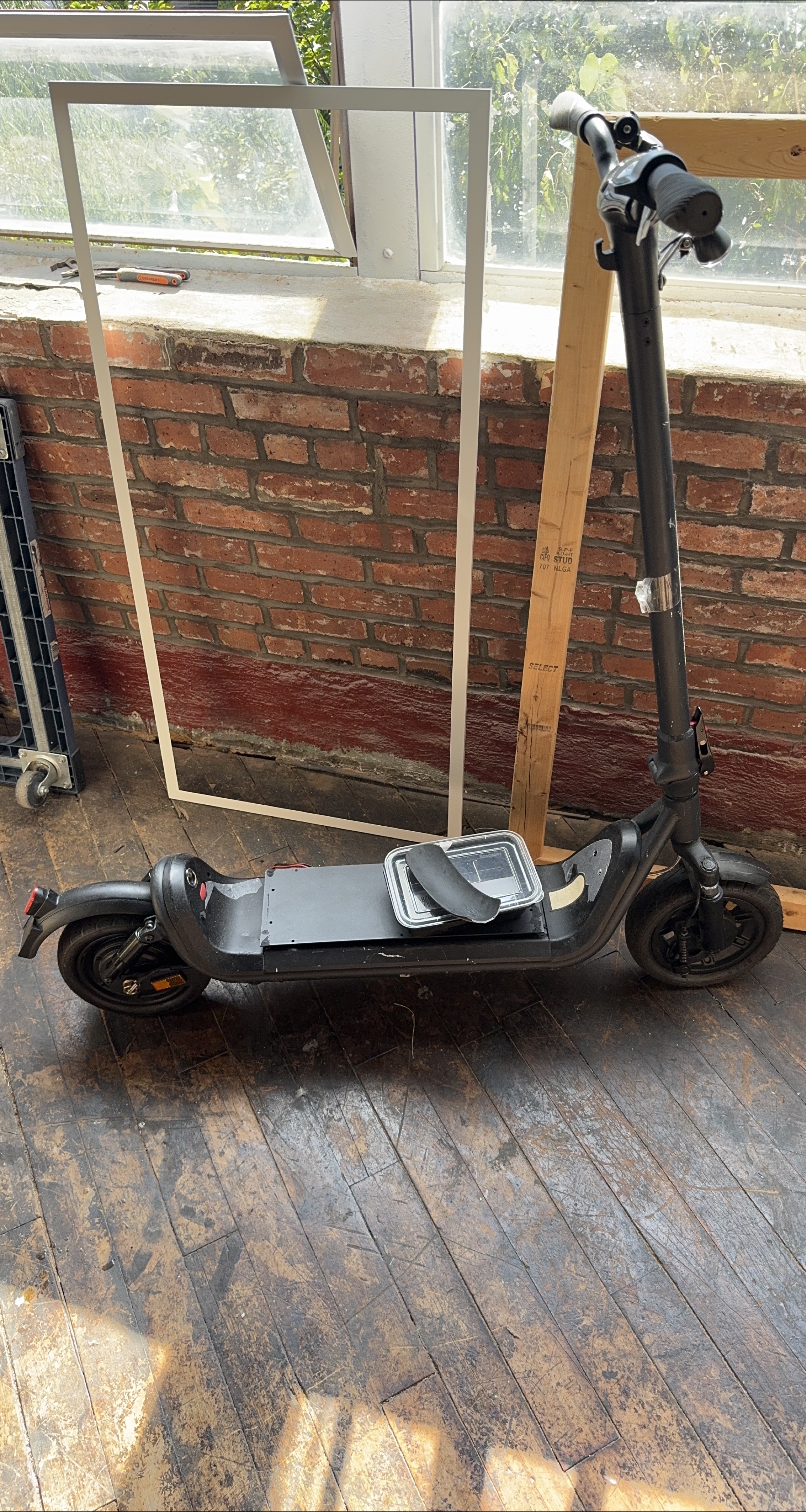 Selling a used black electric scooter. It shows signs of wear, but is still functional