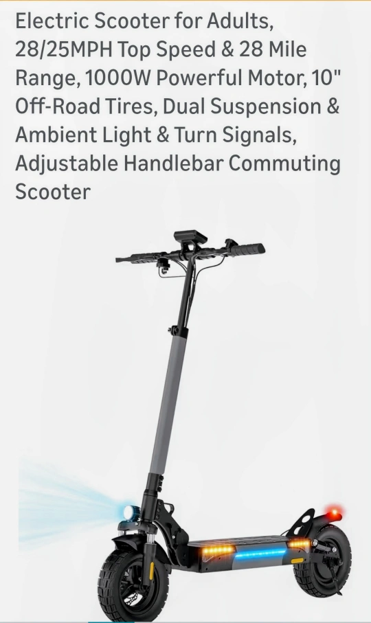 229Selling an electric scooter designed for adults! It boasts a top speed of 28 mph and a long range of 28 miles. Key features include: - 1000W powerful motor - 10-inch off-road tires - Dual suspension damping for a smoother ride - 4 types of lighting systems (front light, taillight, turn signal, and ambient light)* needs rear tire replacement $25 on Amazon*