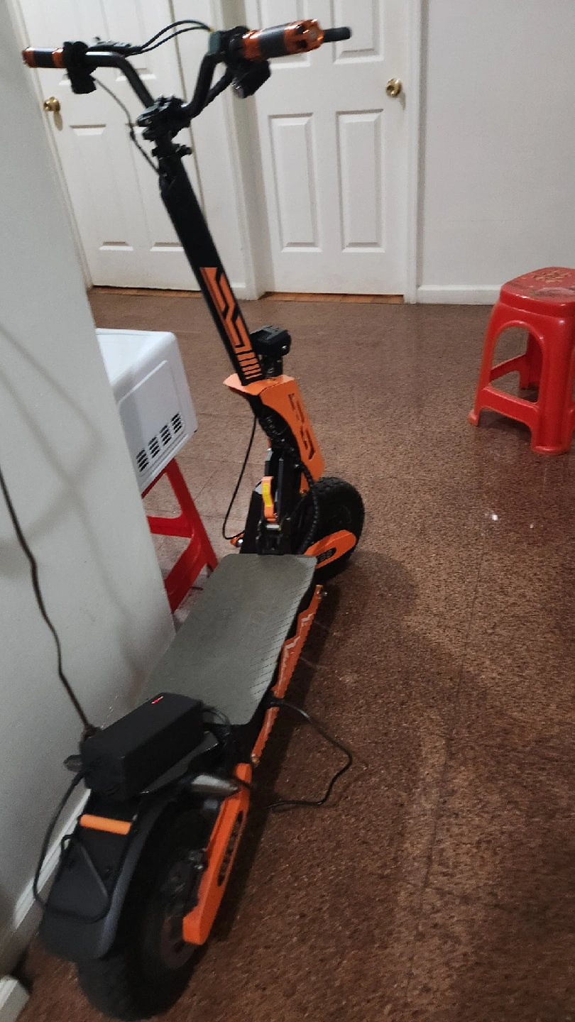 Selling an electric scooter in orange and black. It looks like it's in good condition and ready for a new owner! The scooter has black handlebars and an orange frame. Perfect for getting around town!