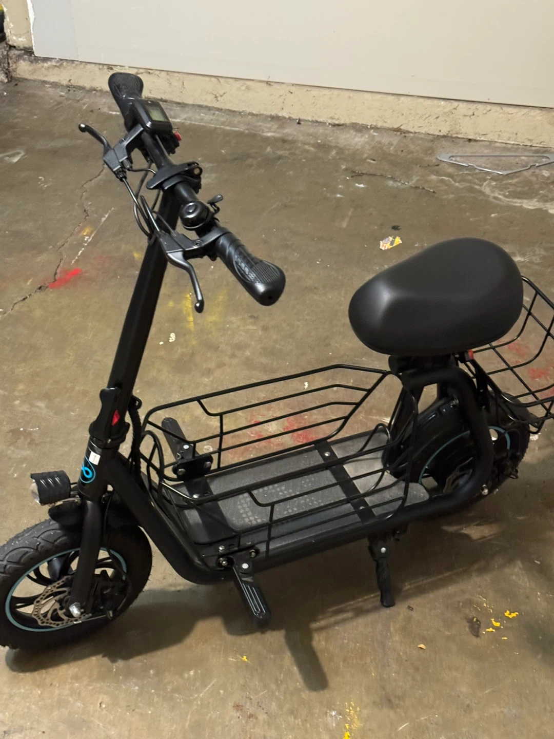 10Selling an electric scooter with a seat and a large storage basket. It has a motor of 550 W and a maximum speed of 18.6 MPH, with a range of 20 miles. Great for adults and includes a basket for pets, dogs, and articles