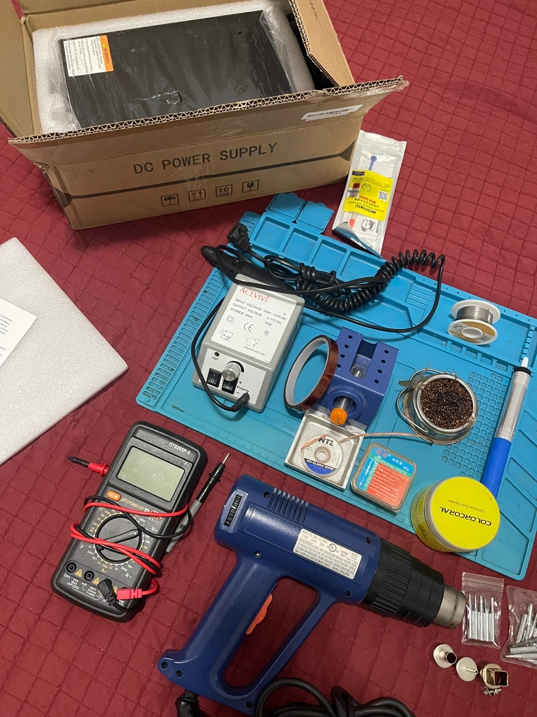 65Selling a complete electronics repair kit! It includes a NICE-POWER DC power supply, a heat gun, a multimeter (DT9205P-6), soldering iron, solder, and various other tools and components. It also comes with its original box