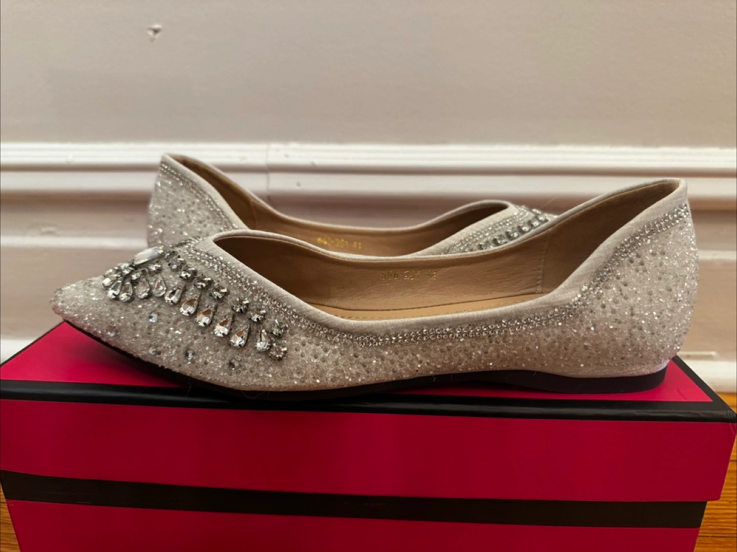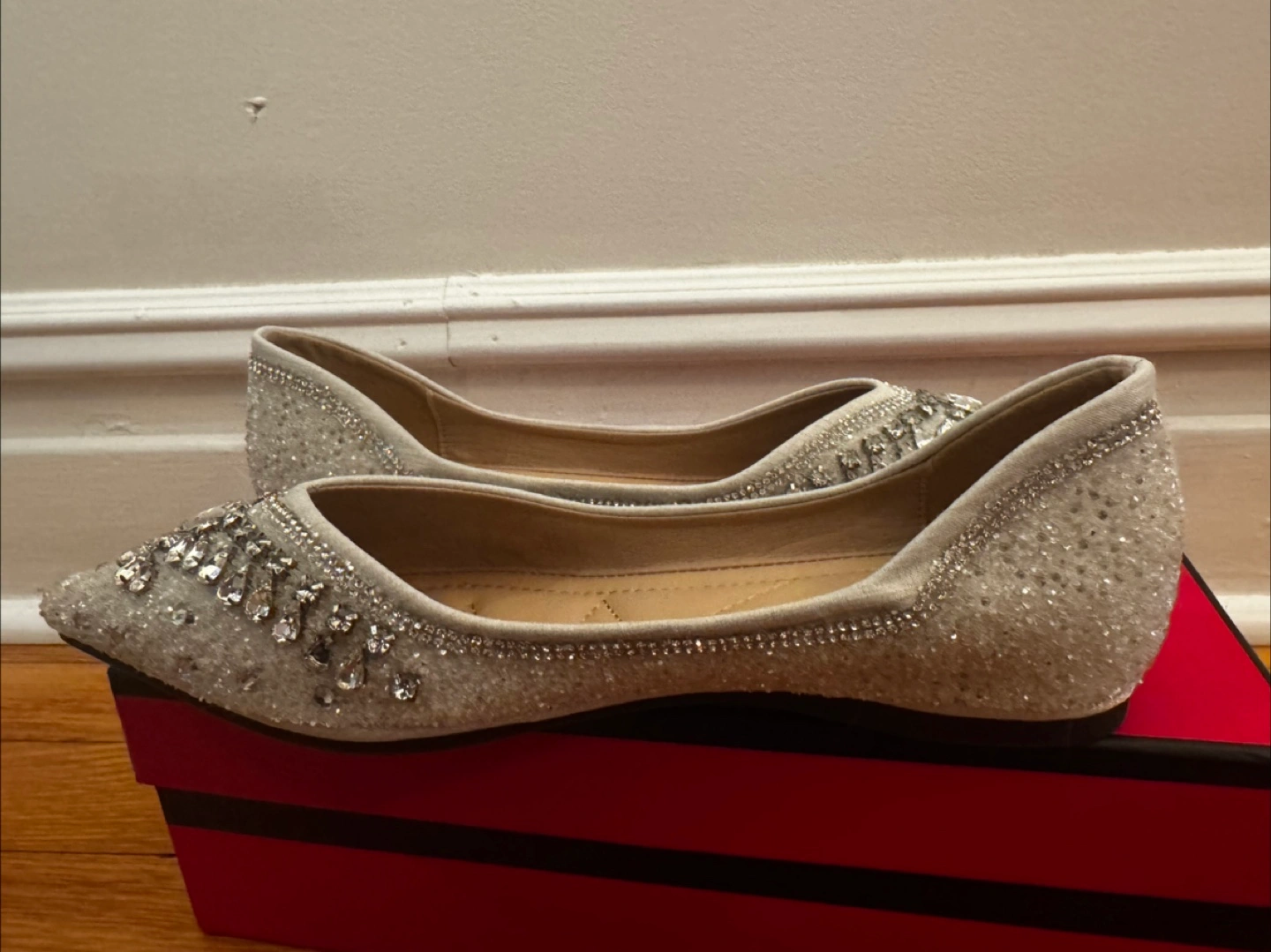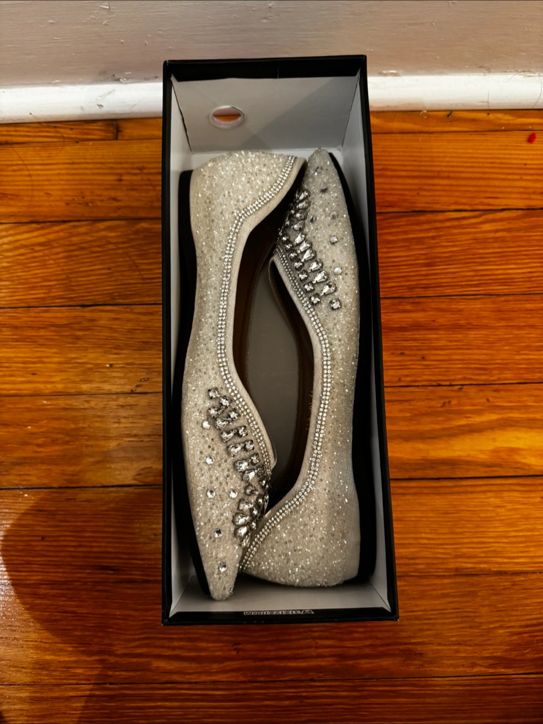 54Beautiful silver sparkly flats. Pointed toe. Rhinestone and bead embellishments.