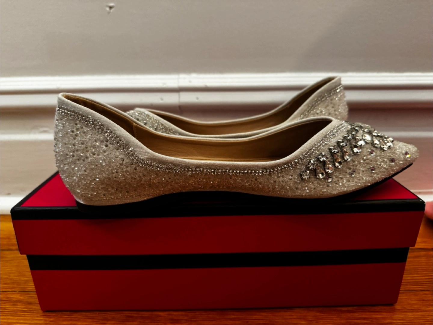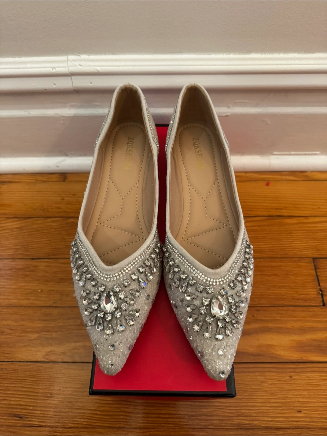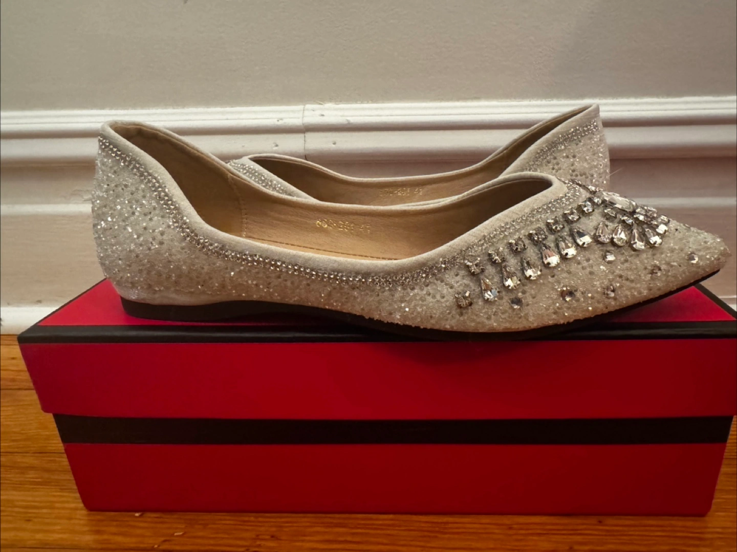 54Beautiful silver sparkly flats. Pointed toe. Rhinestone and bead embellishments.