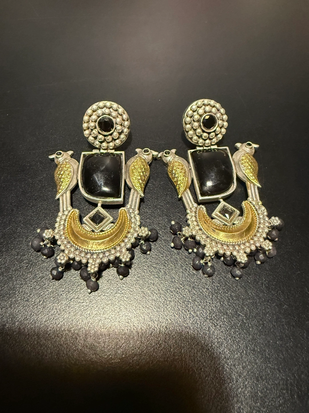 Stunning silver and gold tone earrings. Feature black stones, bird accents, and dangling beads. Beautiful statement piece.