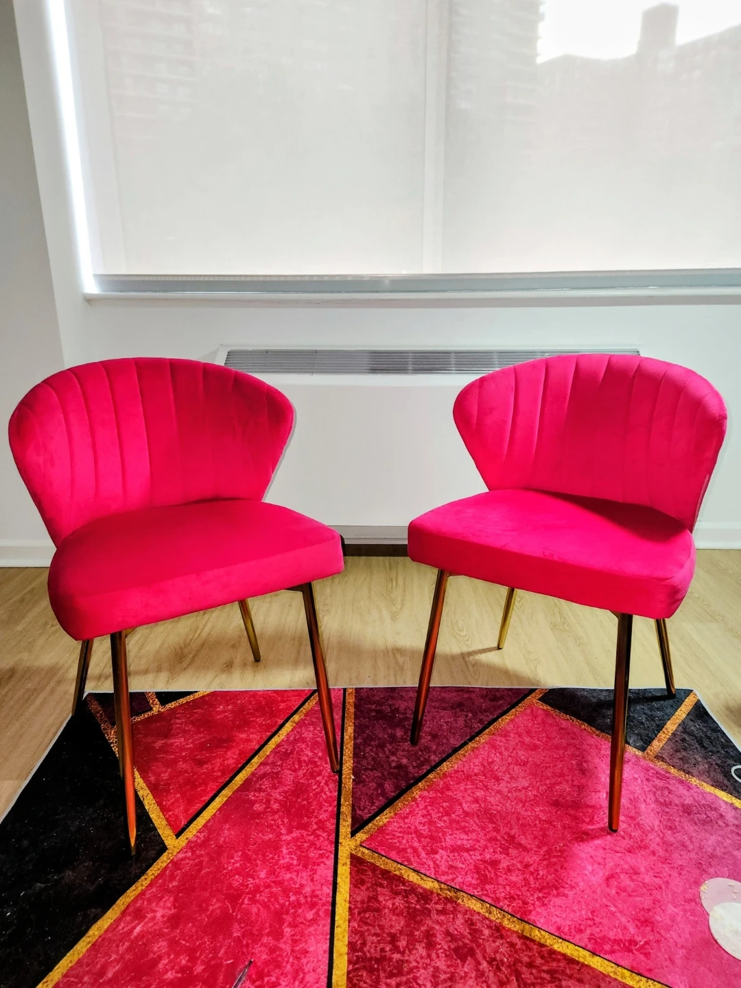 68Stunning set of velvet pink chairs. Legs have a beautiful gold finish. Like-New condition and perfect for the dining room, living room or bedroom. ๐ซ