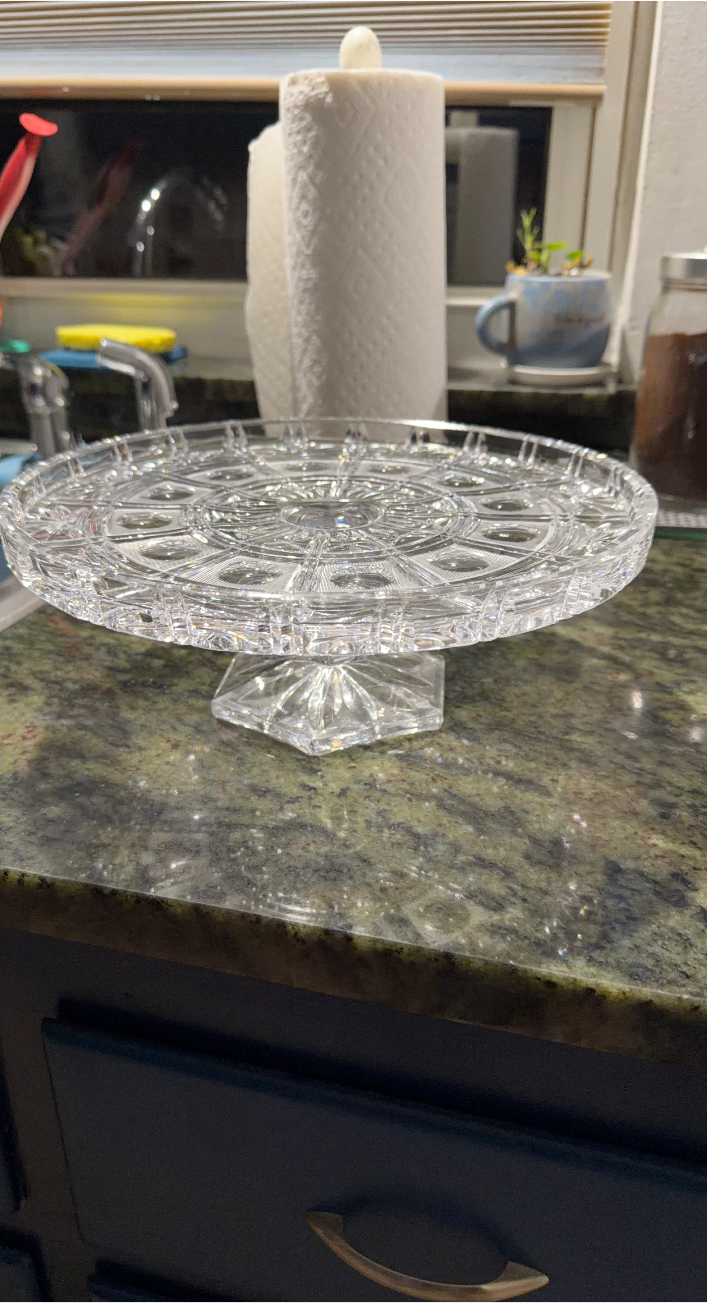 299Selling a lovely crystal cake stand. It's perfect for displaying cakes or other desserts. The stand has a beautiful design and is in great condition. It will surely add a touch of elegance to any table setting
