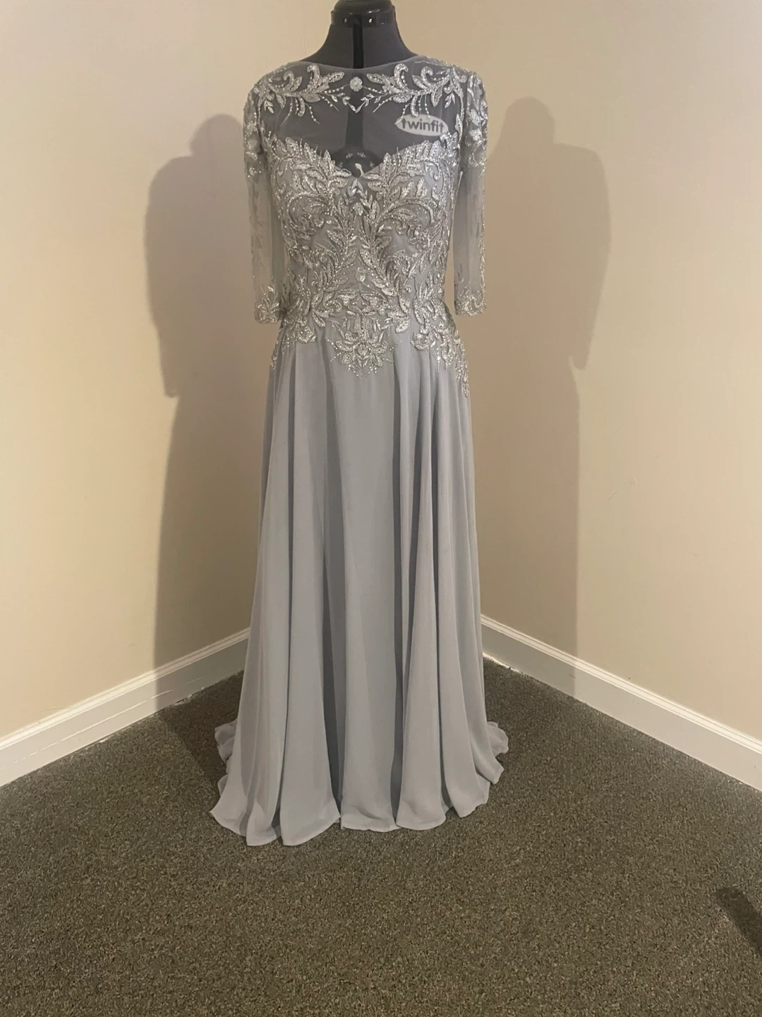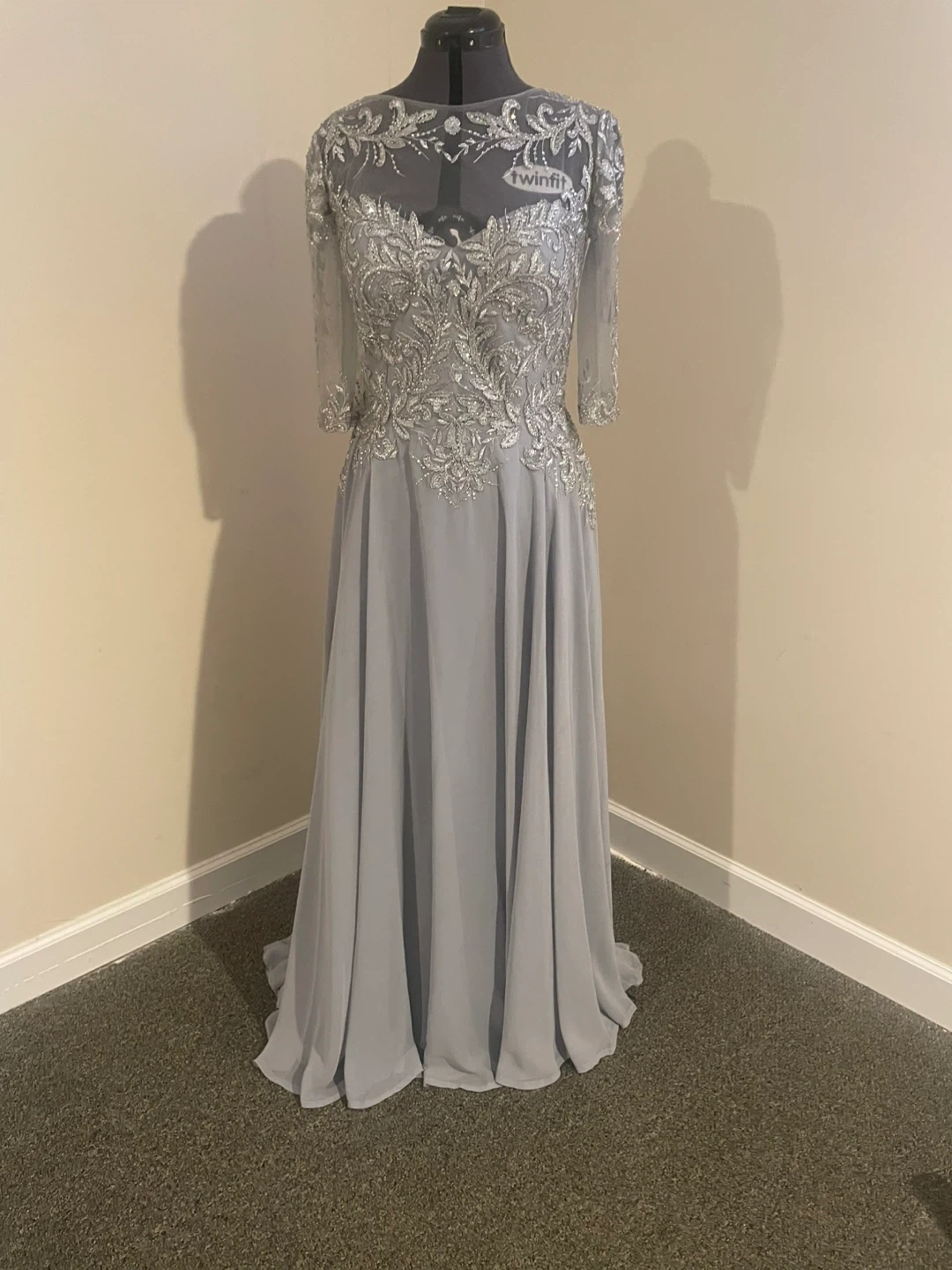 21Selling a beautiful formal dress in a lovely silver/gray color. It features intricate detailing on the bodice and sleeves. Perfect for a special occasion! Great as a Mother of the Bride dress