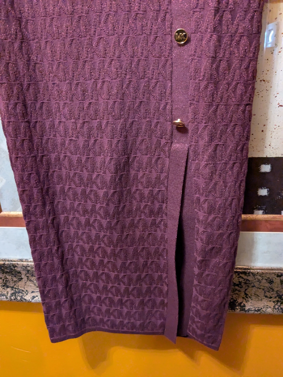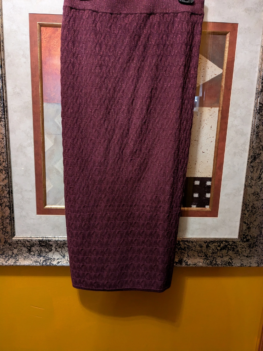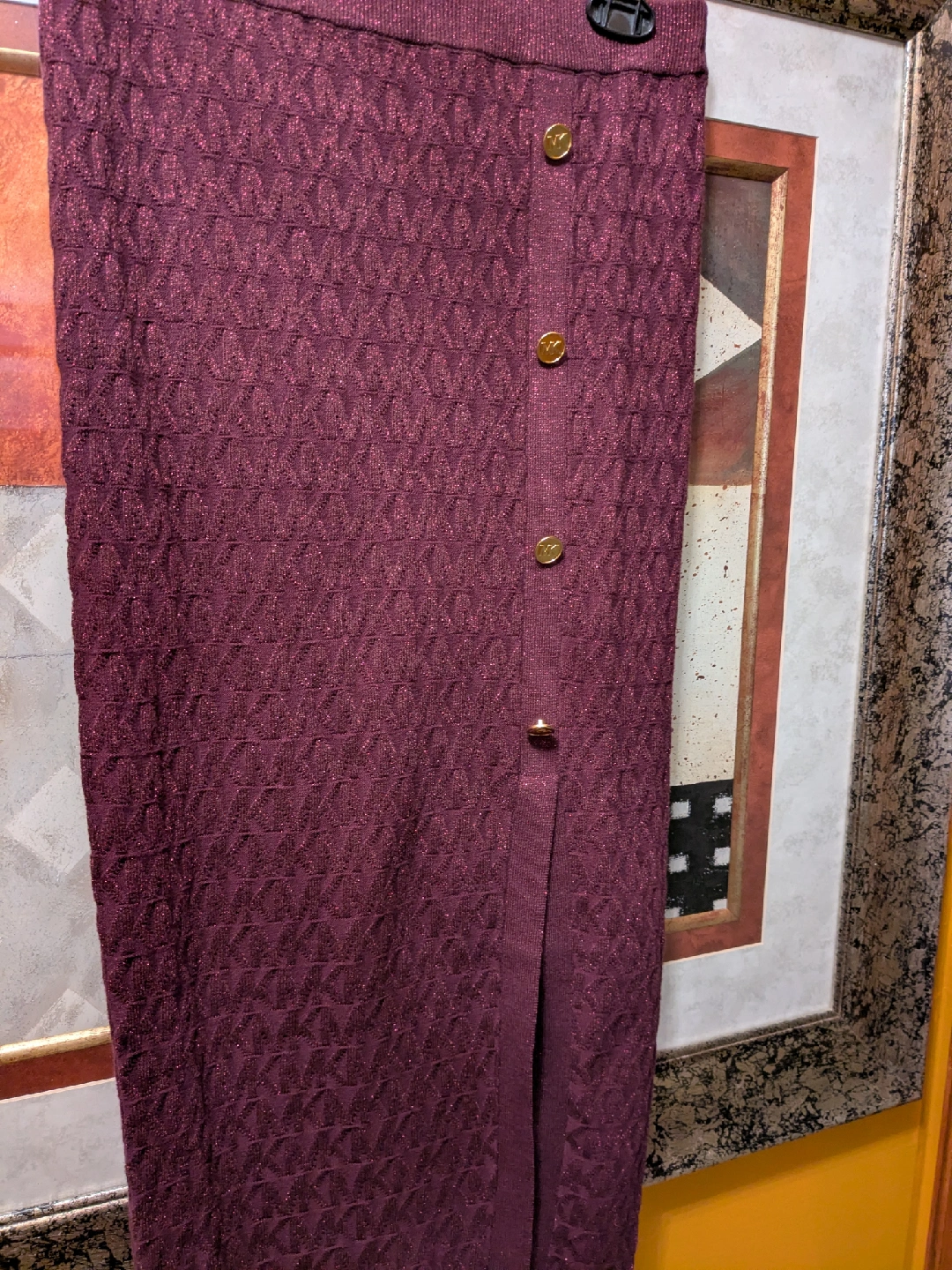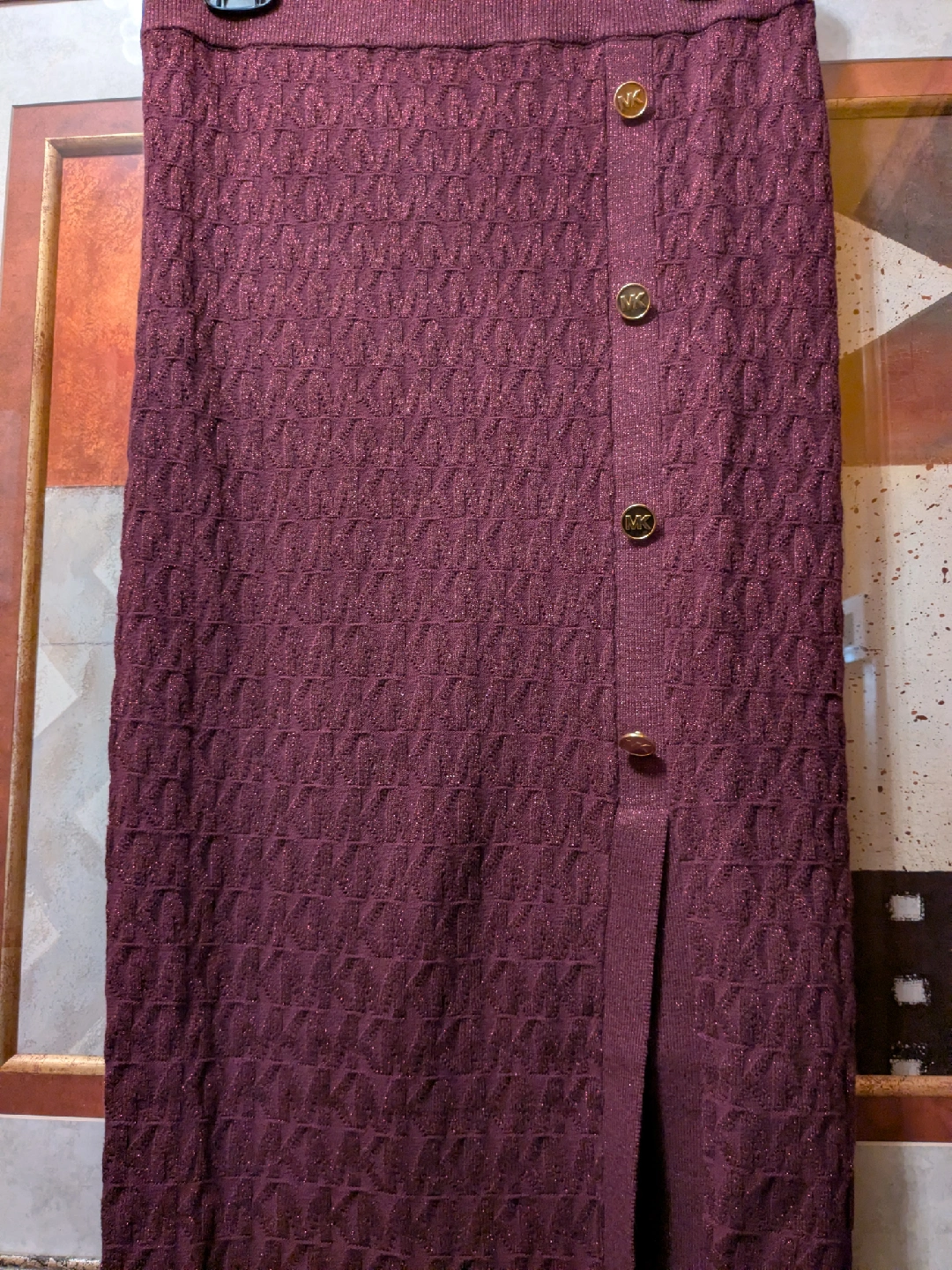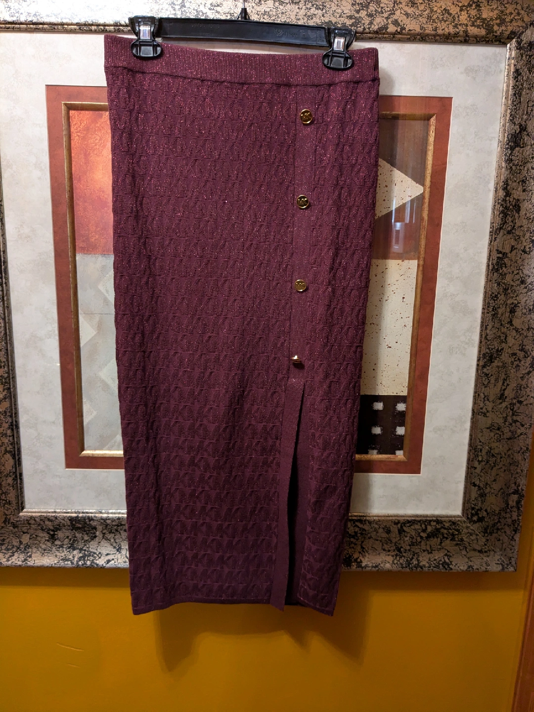 Discover sophisticated style with this Michael Kors burgundy knit midi skirt. The rich color and textured fabrication make it a standout piece, while the decorative gold buttons add a refined touch. The midi length and side slit create a flattering and modern silhouette, ideal for a variety of occasions. Perfect for: Workwear Dinner dates Casual chic **EXCELLENT PRE-OWNED CONDITION**