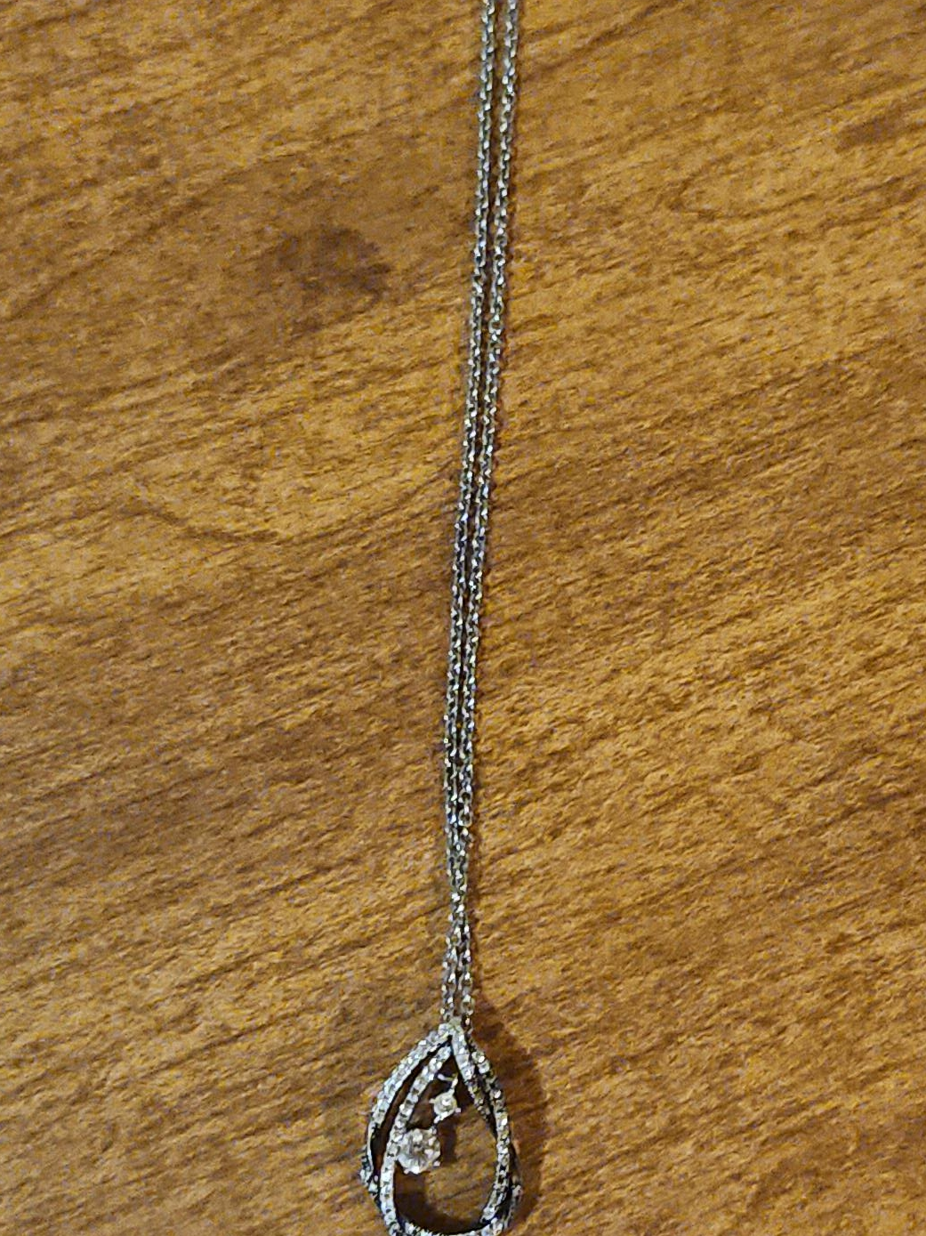65This is a beautiful silver necklace featuring a teardrop-shaped pendant. It's perfect for adding a touch of elegance to any outfit!