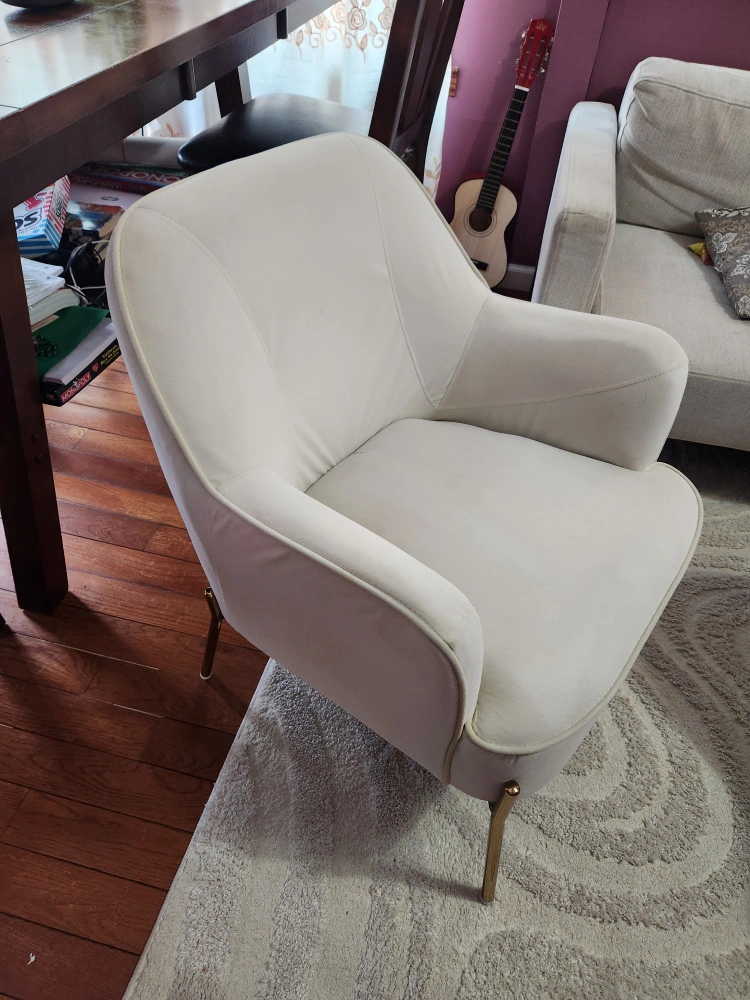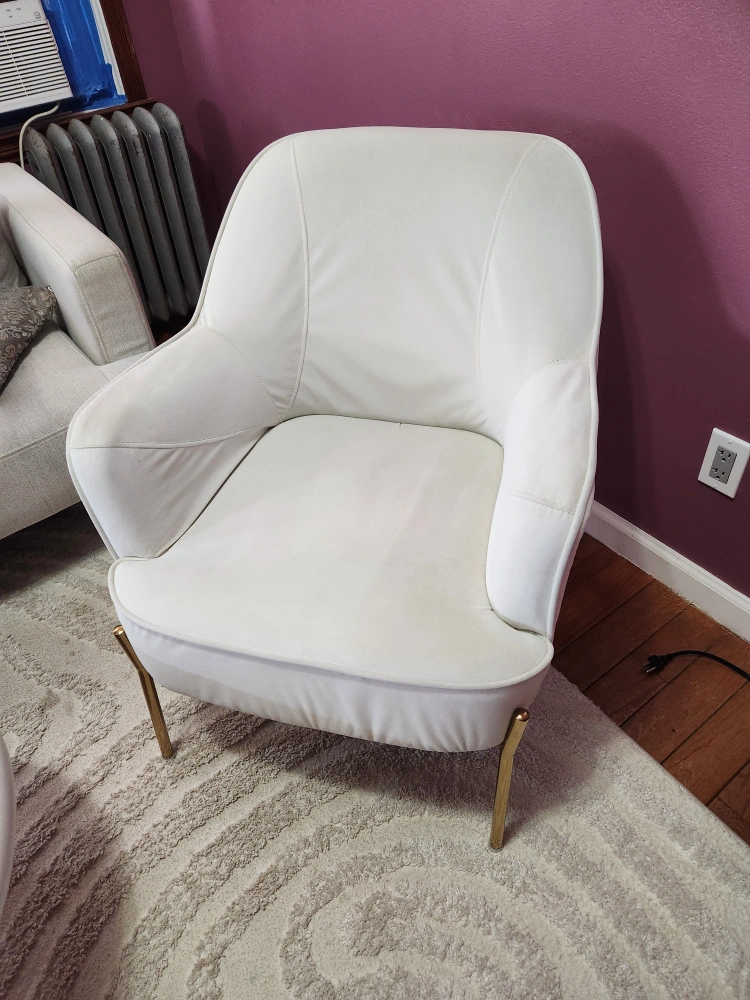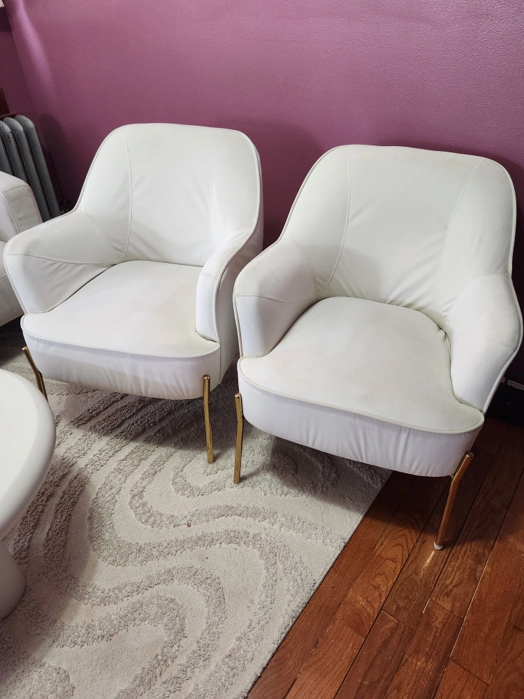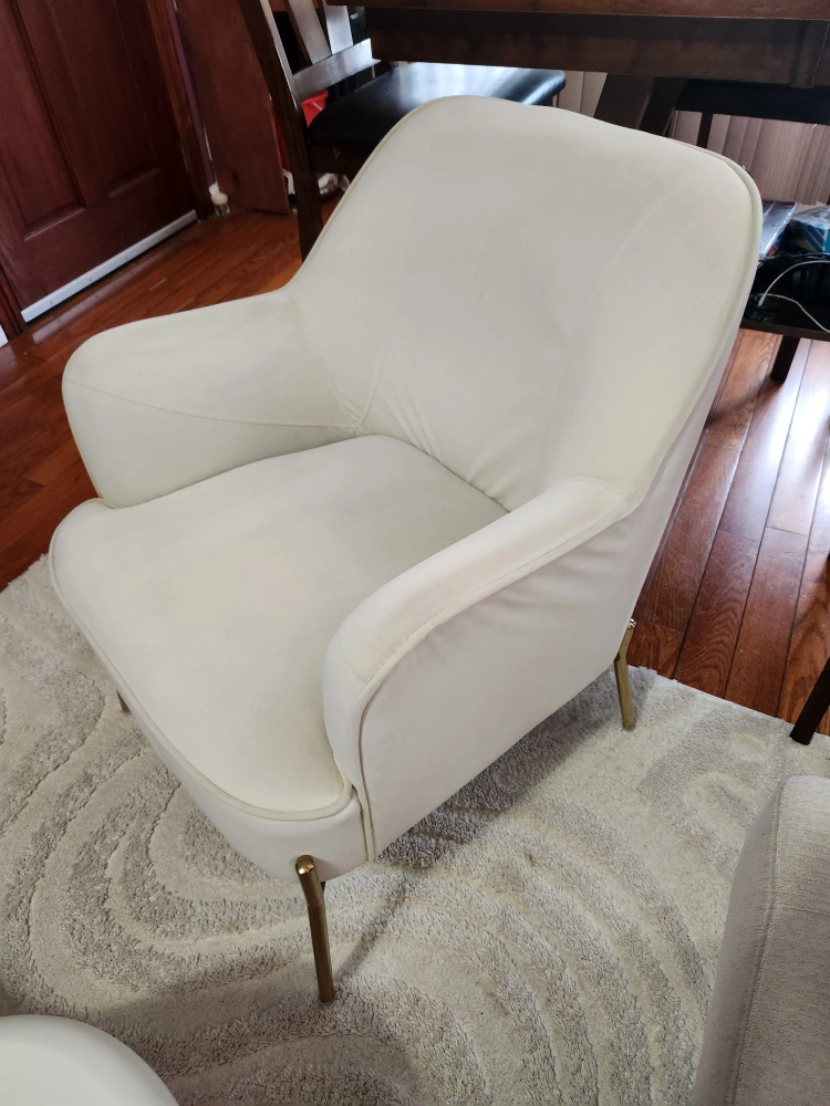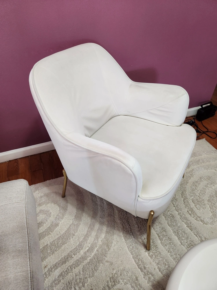 This is a stylish white accent chair that would look great in any living room or bedroom! It features a sleek design with gold legs, adding a touch of elegance to your space. The chair is in good condition and ready for a new home