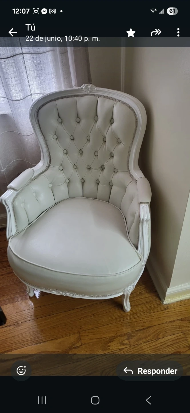 60Selling a beautiful accent chair with a tufted back! It's a lovely white color and would look great in any room. The chair has a classic design with elegant details. It's in good condition and ready for a new home!