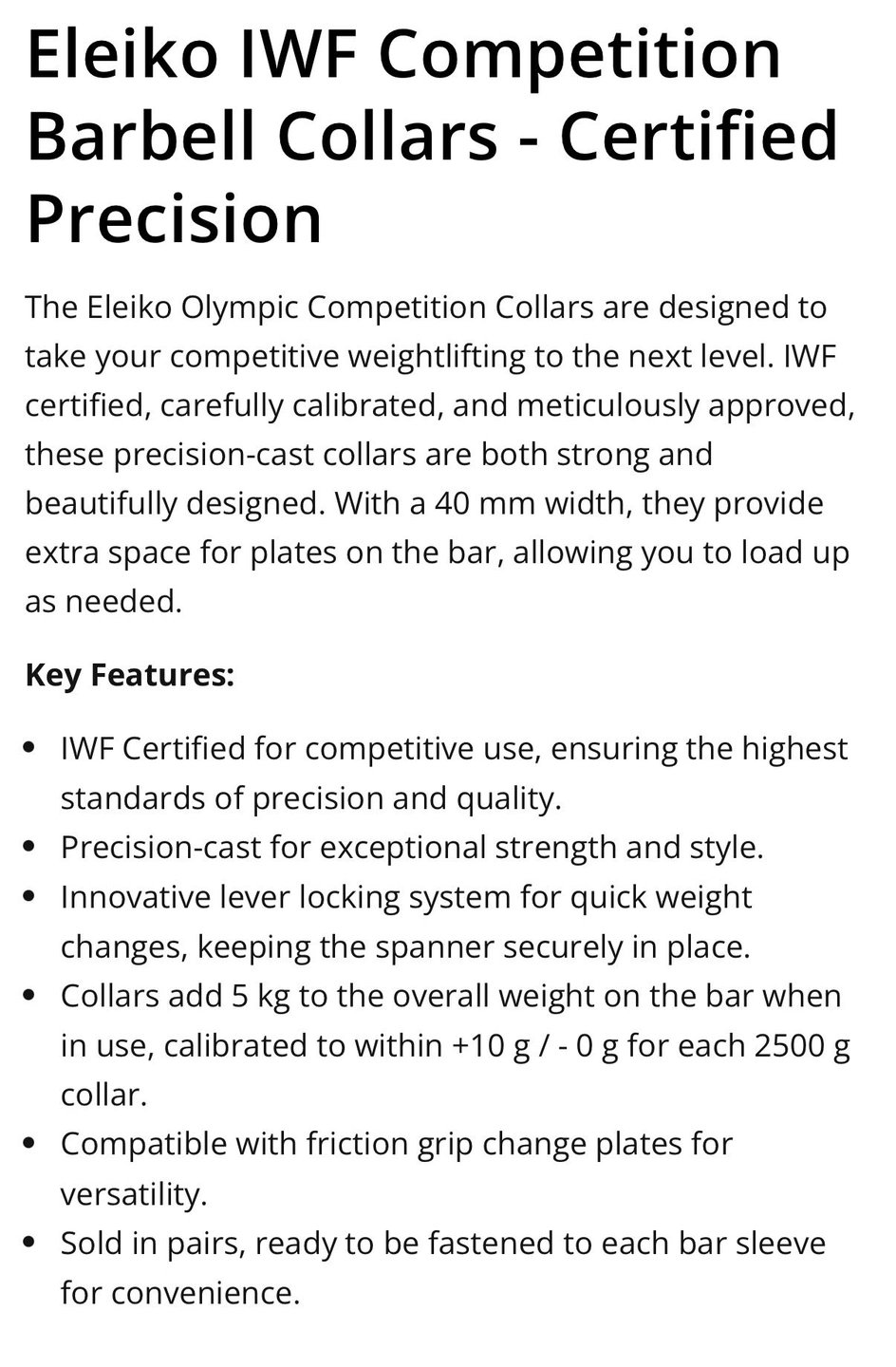 15Eleiko IWF Competition Barbell Collars. These collars are a trusted choice among professional weightlifters, ensuring your plates stay securely in place during competitions. Join the ranks of champions who trust Eleiko for their weightlifting equipment. Type: Olympic Brand: Eleiko