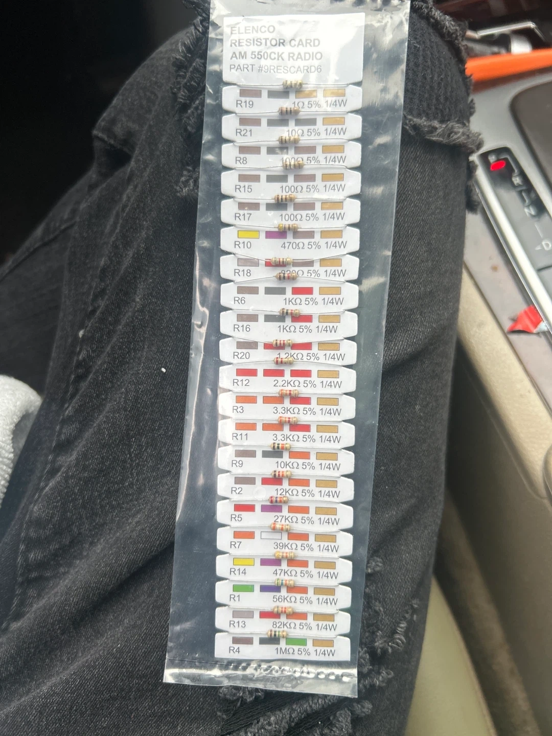 10Selling an Elenco resistor card AM 550CK Radio, part #9RESCARD6. It includes various resistors such as 10Ω, 100Ω, 1000Ω, 470Ω, 1.2kΩ, 2.2kΩ, 3.3kΩ, 10kΩ, 12kΩ, 27kΩ, 39kΩ, 47kΩ, 56kΩ, 82kΩ, and 1MΩ, all 5% 1/4W