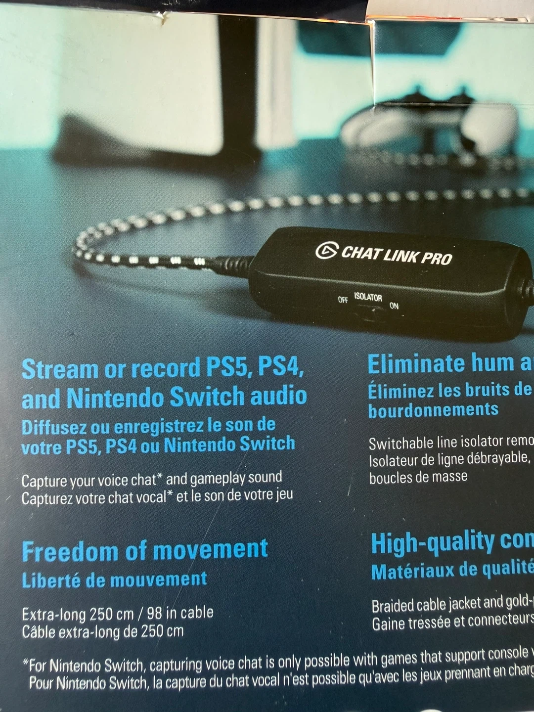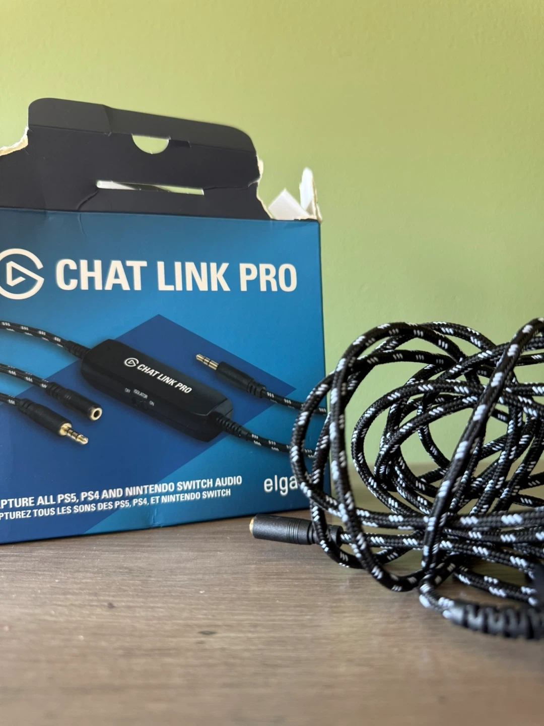 10Selling an Elgato Chat Link Pro! It allows you to stream or record audio from your PS5, PS4, and Nintendo Switch. - Eliminates hum and buzz - Features a switchable line isolator - Has an extra-long 250 cm / 98-inch cable for freedom of movement - Braided cable jacket and gold-plated connectors for high-quality connections Box not included