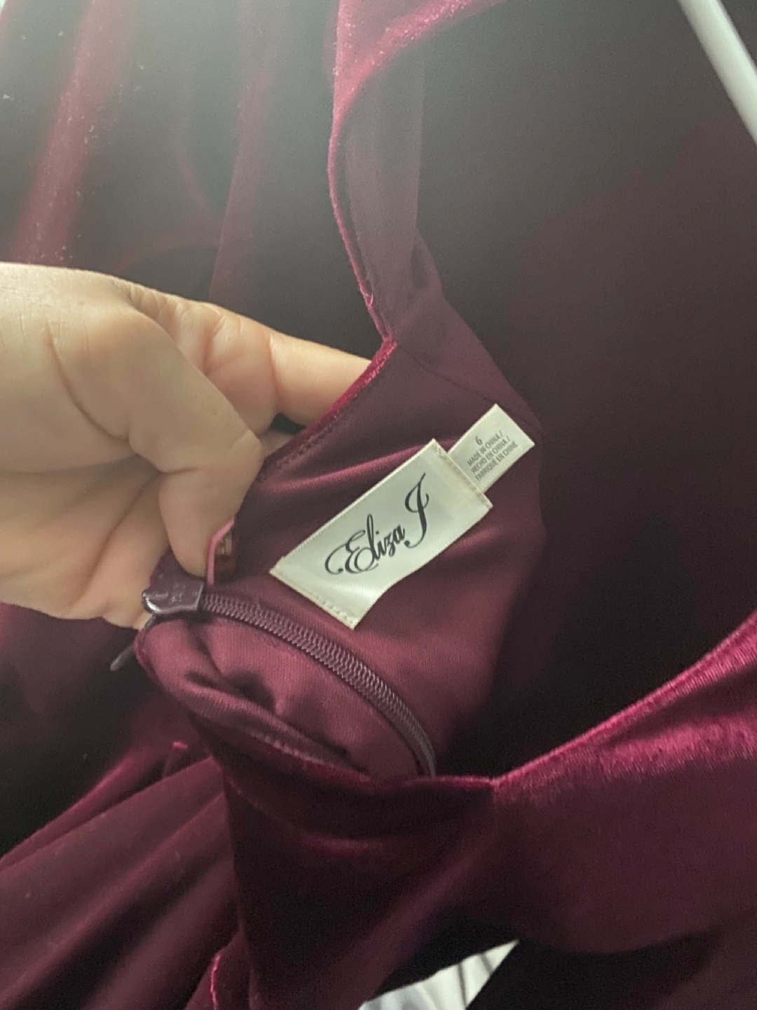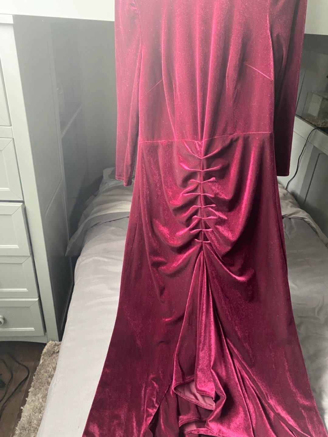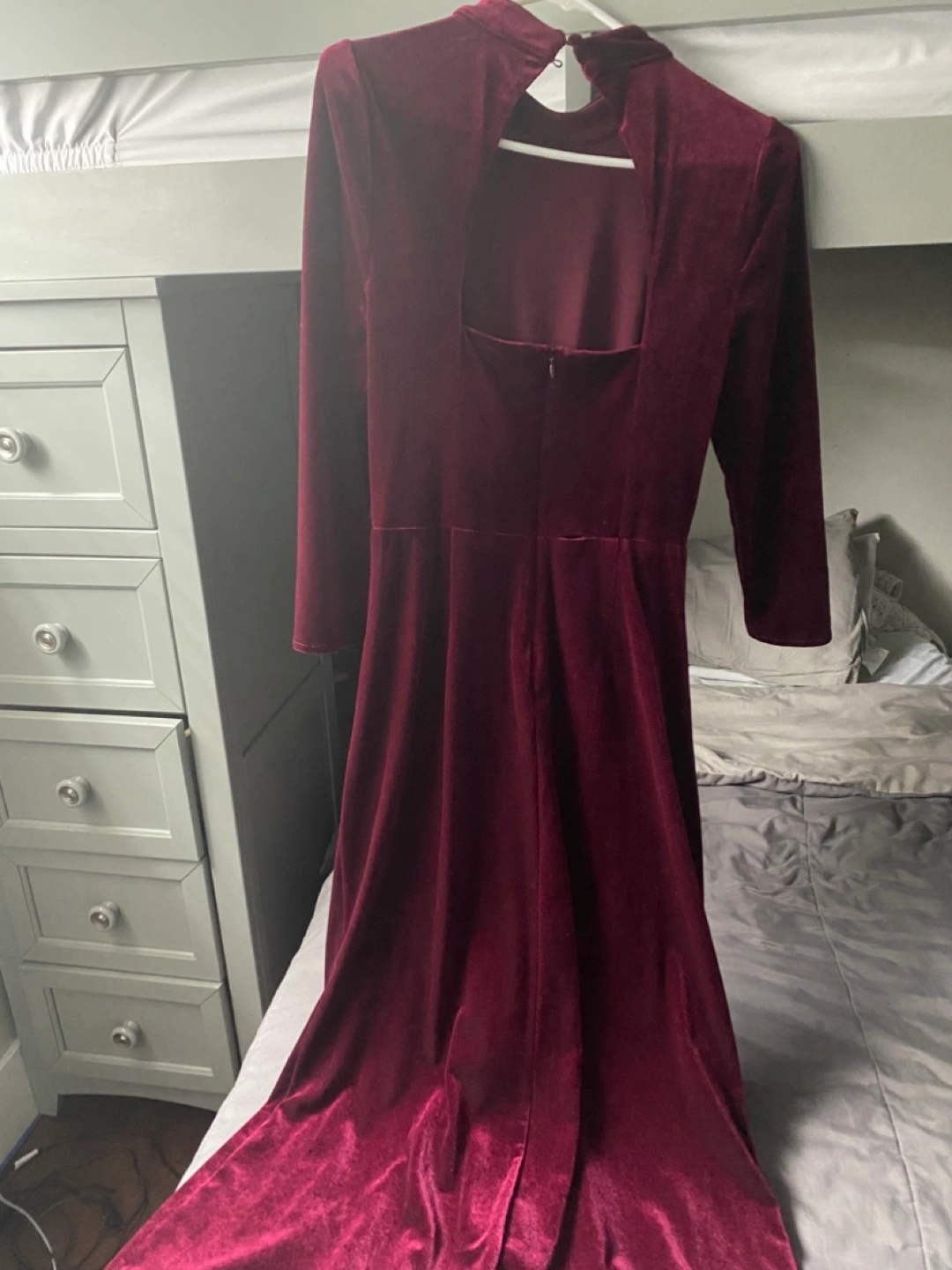 Burgundy velvet maxi dress. Long sleeves. Keyhole back. Back ruching. Size 6.