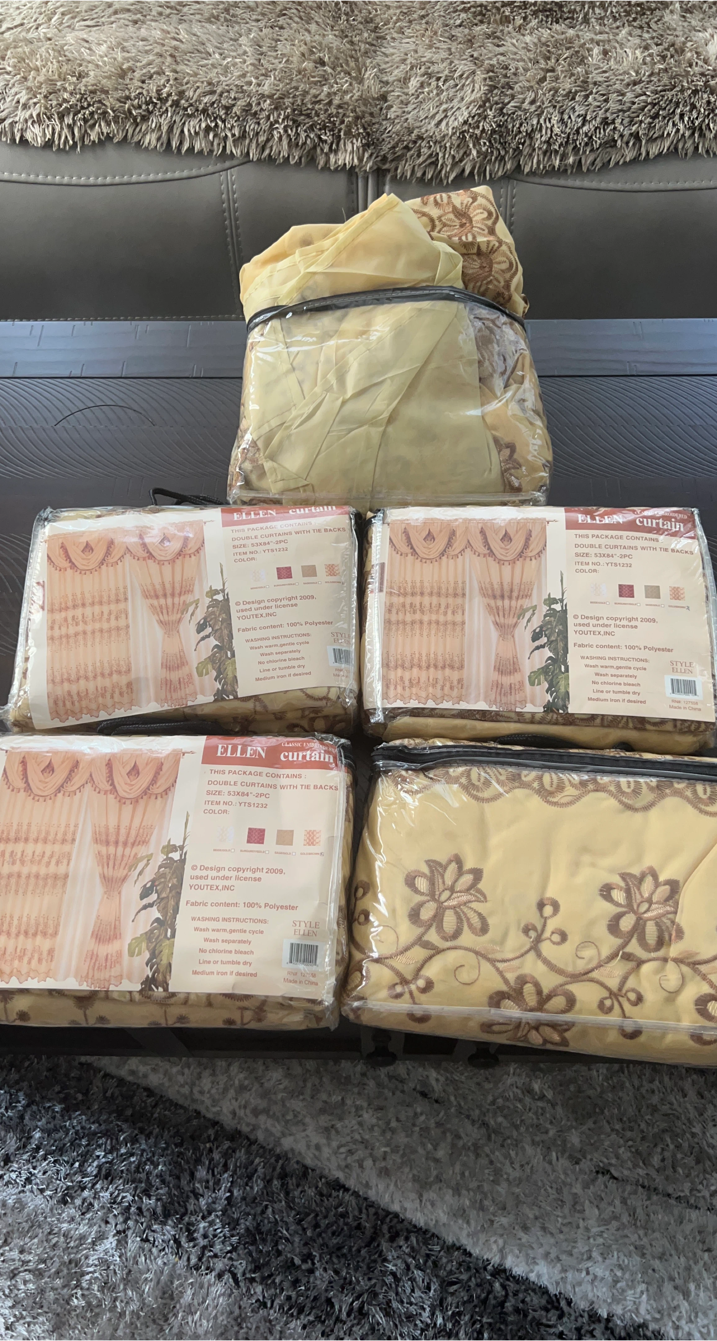 These Ellen curtains are double curtains with tie backs, size 53x84"-2PC. The fabric content is 100% Polyester. Washing instructions include: wash warm, gentle cycle, wash separately, no chlorine bleach, line or tumble dry, and medium iron if desired