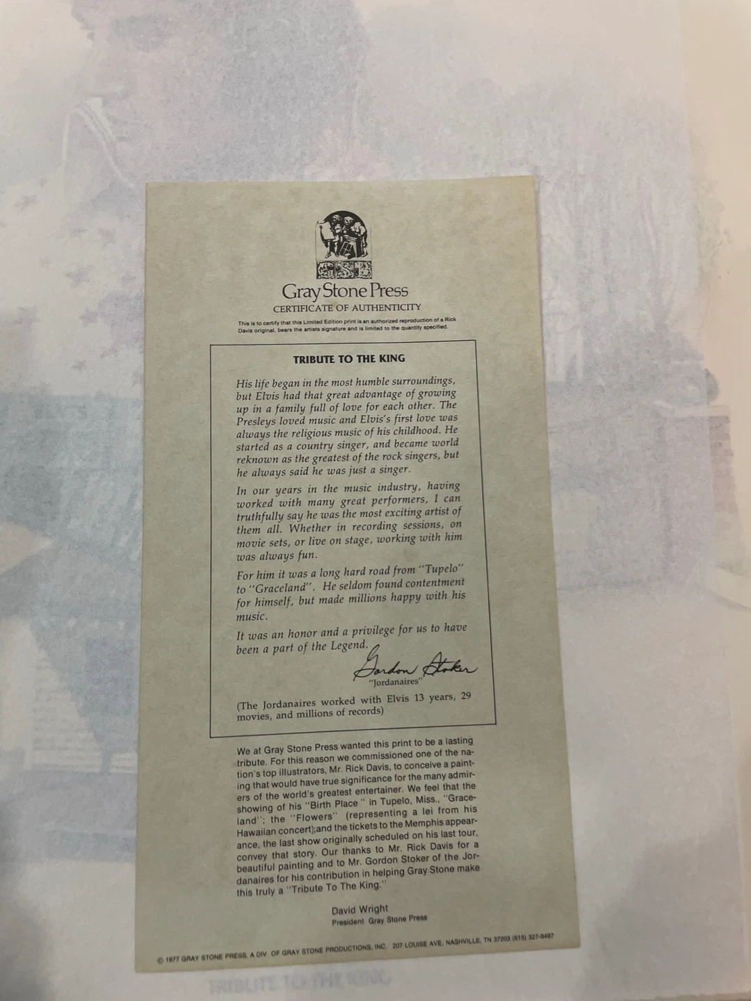 Selling a print titled 'Tribute to The King' featuring Elvis Presley. It's a beautiful piece and would look great in any fan's collection! I’m have the last 8 pieces of this collection.
