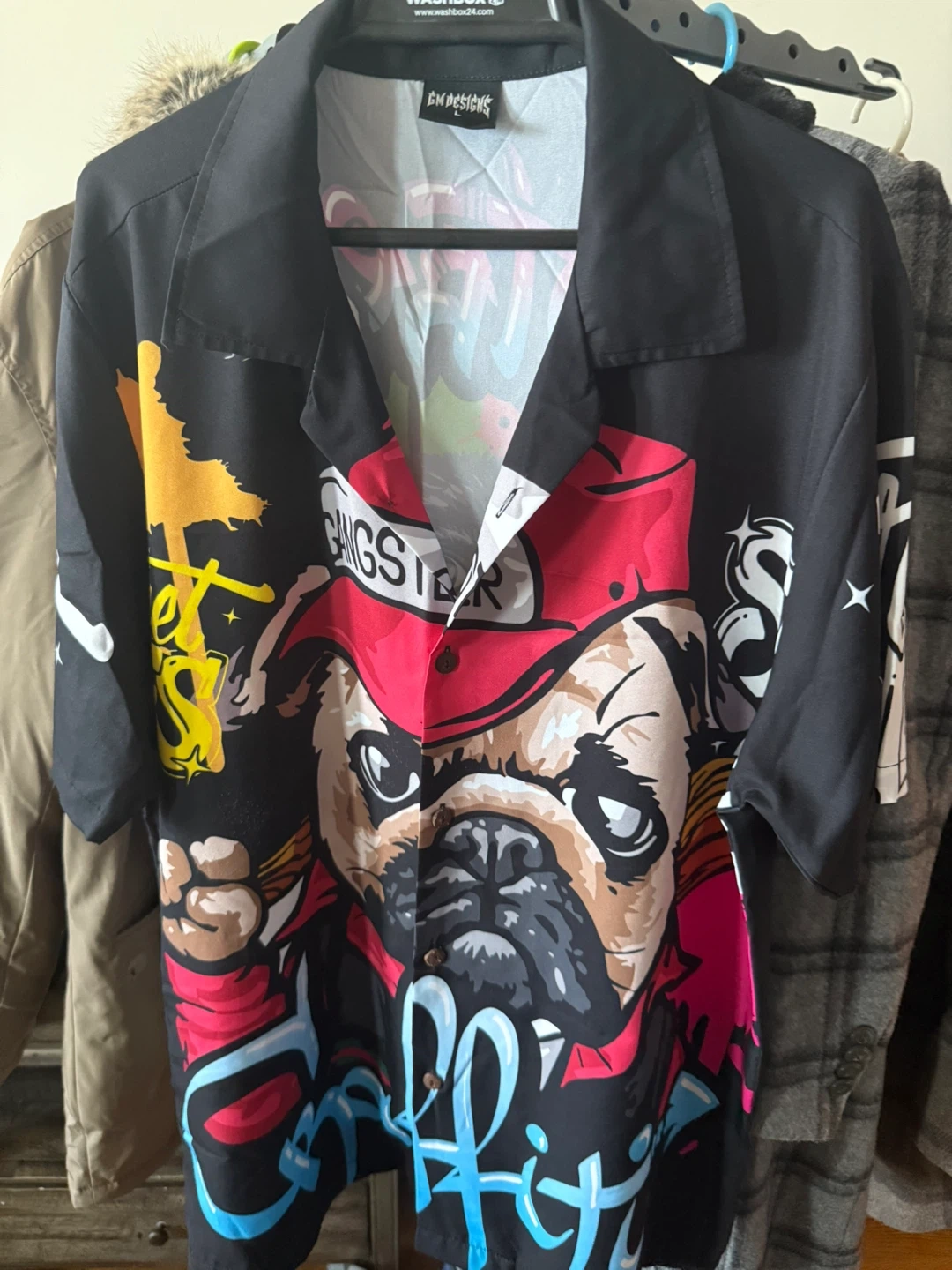 Here's a cool EM DESIGNS shirt with a unique graphic print! It features a fun design with a bulldog wearing a red hat. Perfect for adding some character to your wardrobe
