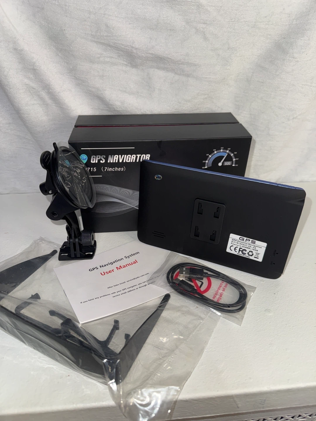 This is a 7-inch GPS Navigator. It comes with a suction cup mount, car charger, and USB cable. Includes user manual.