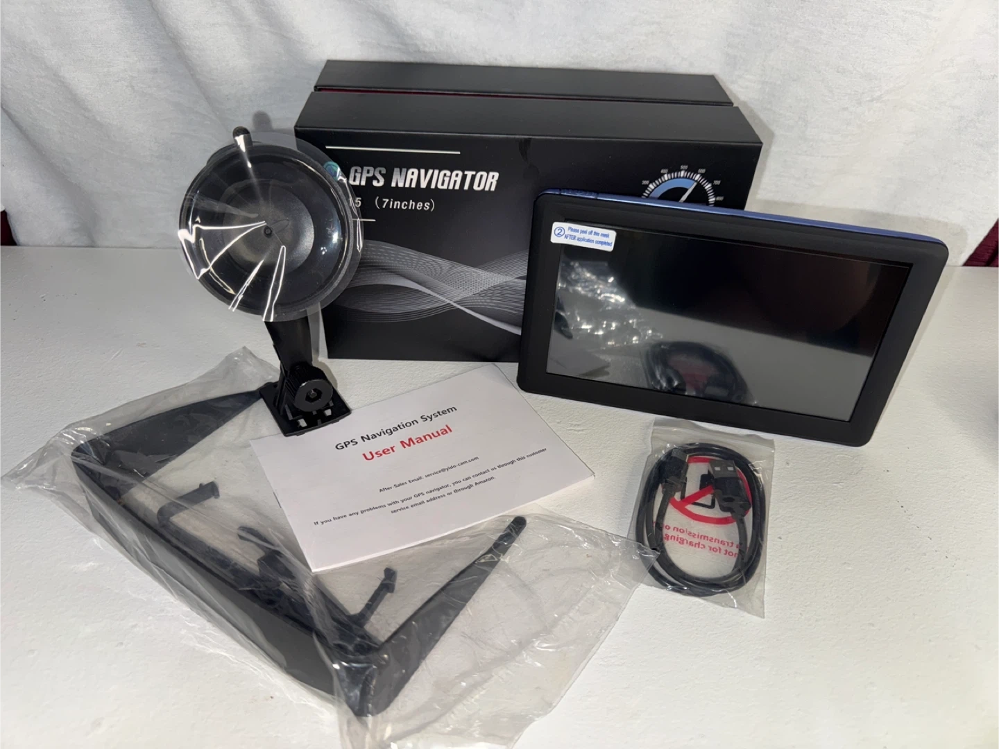 This is a 7-inch GPS Navigator. It comes with a suction cup mount, car charger, and USB cable. Includes user manual.