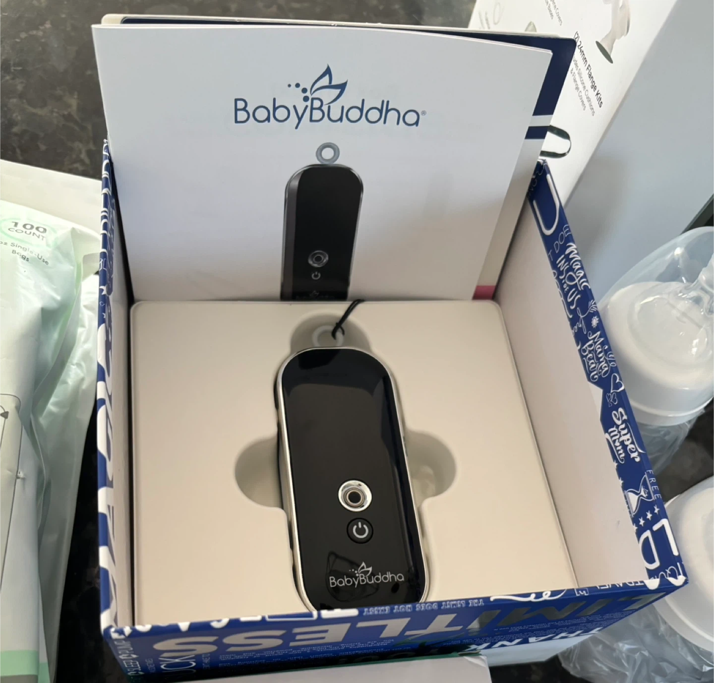 Selling a Baby Buddha breast pump, which comes with all its original components and box! Also included are Motif Medical breastmilk storage bags. Great for new moms!