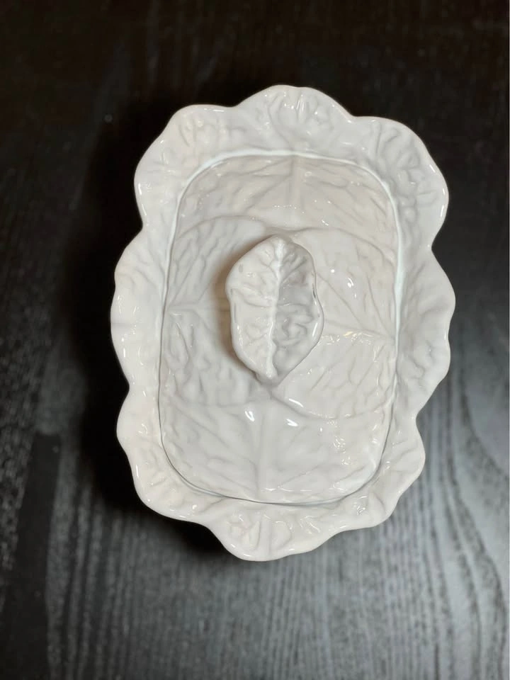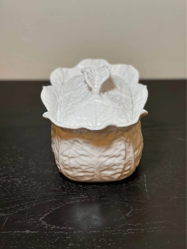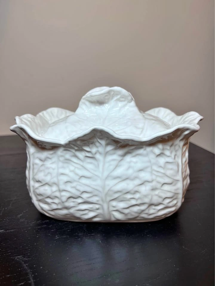 131Embossed Cabbage Leaf White Square Bowl with Lid Covered Vegetable Bowl or Soup Tureen Embossed cabbage leaves with scalloped edge Measurements: approximately 7.5” long x 5.25” wide x 5” tall (with leaf shaped lid). The aesthetic of "cabbageware" or "lettuce ware" dates back to 18th-century Europe with English potter Thomas Whieldon creating early examples. The style was famously popularized in the late 19th century by Portuguese artist Rafael Bordallo Pinheiro, who began factory production in 1885. In the 1960s, American artist Dodie Thayer revived the trend, creating handmade pieces collected by figures like Jacqueline Kennedy Onassis, further cementing the style's timeless appeal.