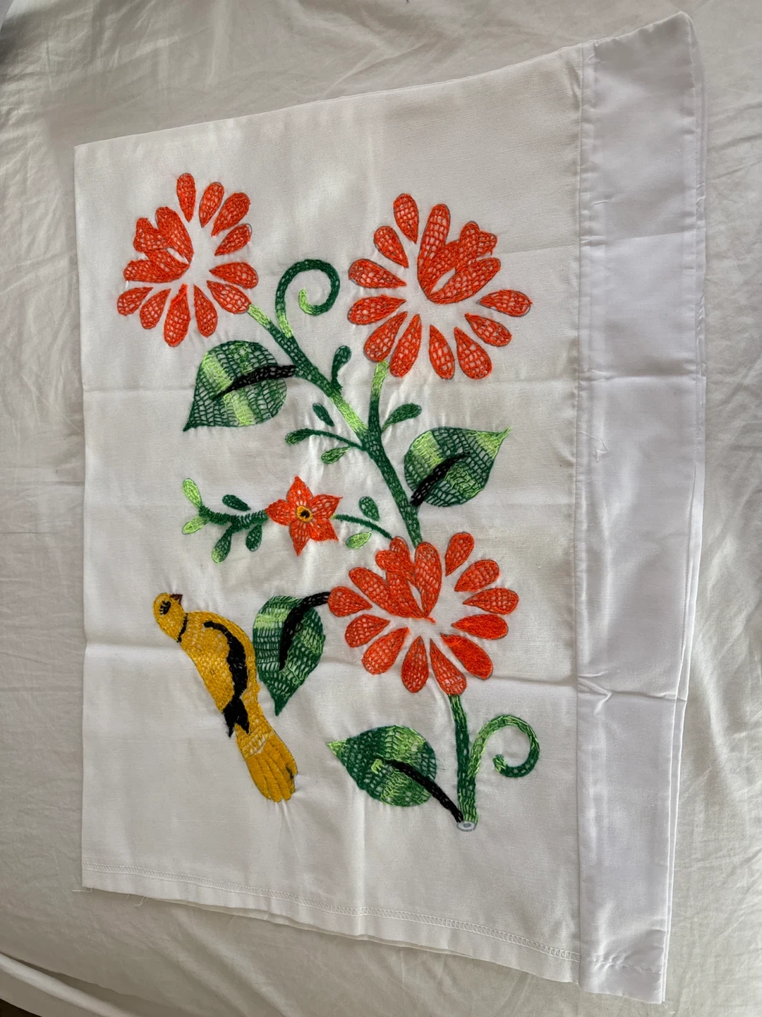 This is a white pillowcase with beautiful floral embroidery. It features orange flowers, green leaves, and a cute yellow bird. It would add a lovely touch to any bedroom!