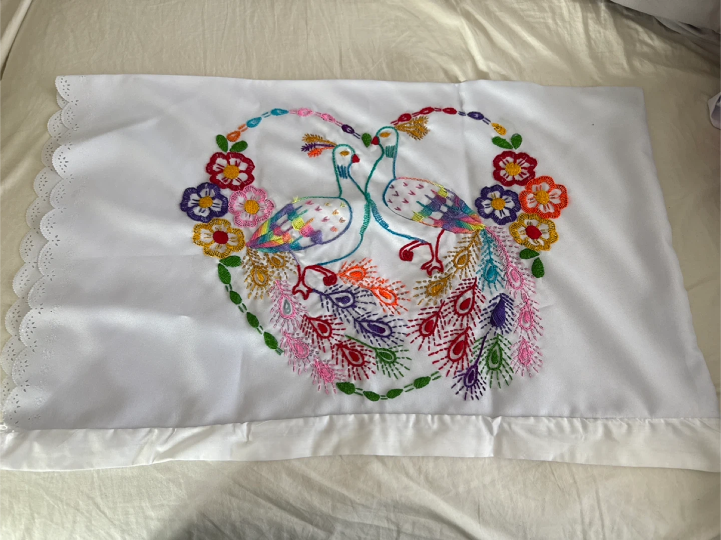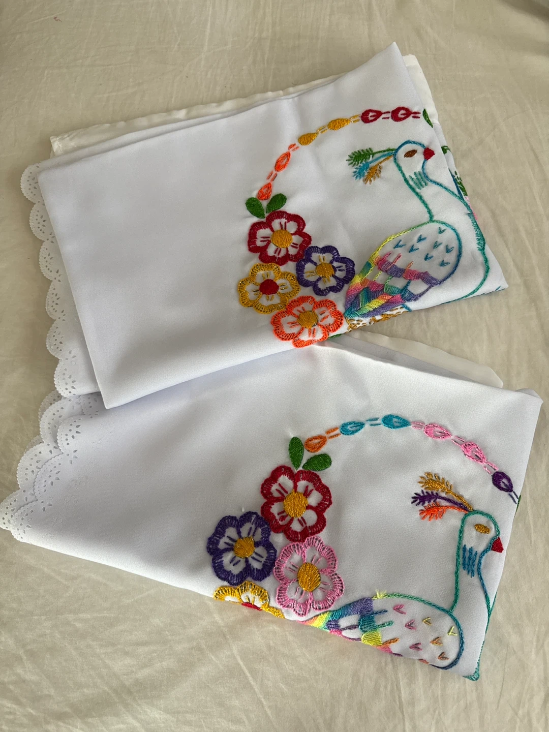 I have a set of two embroidered pillowcases for sale. They feature a beautiful peacock and floral design with colorful stitching on a white background. These pillowcases are in great condition and would add a lovely touch to any bedroom!