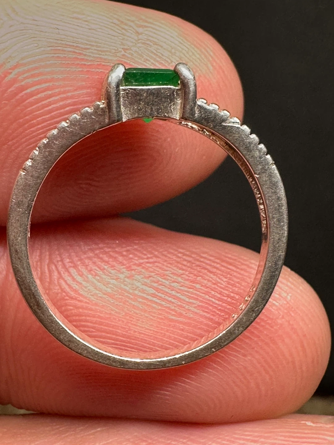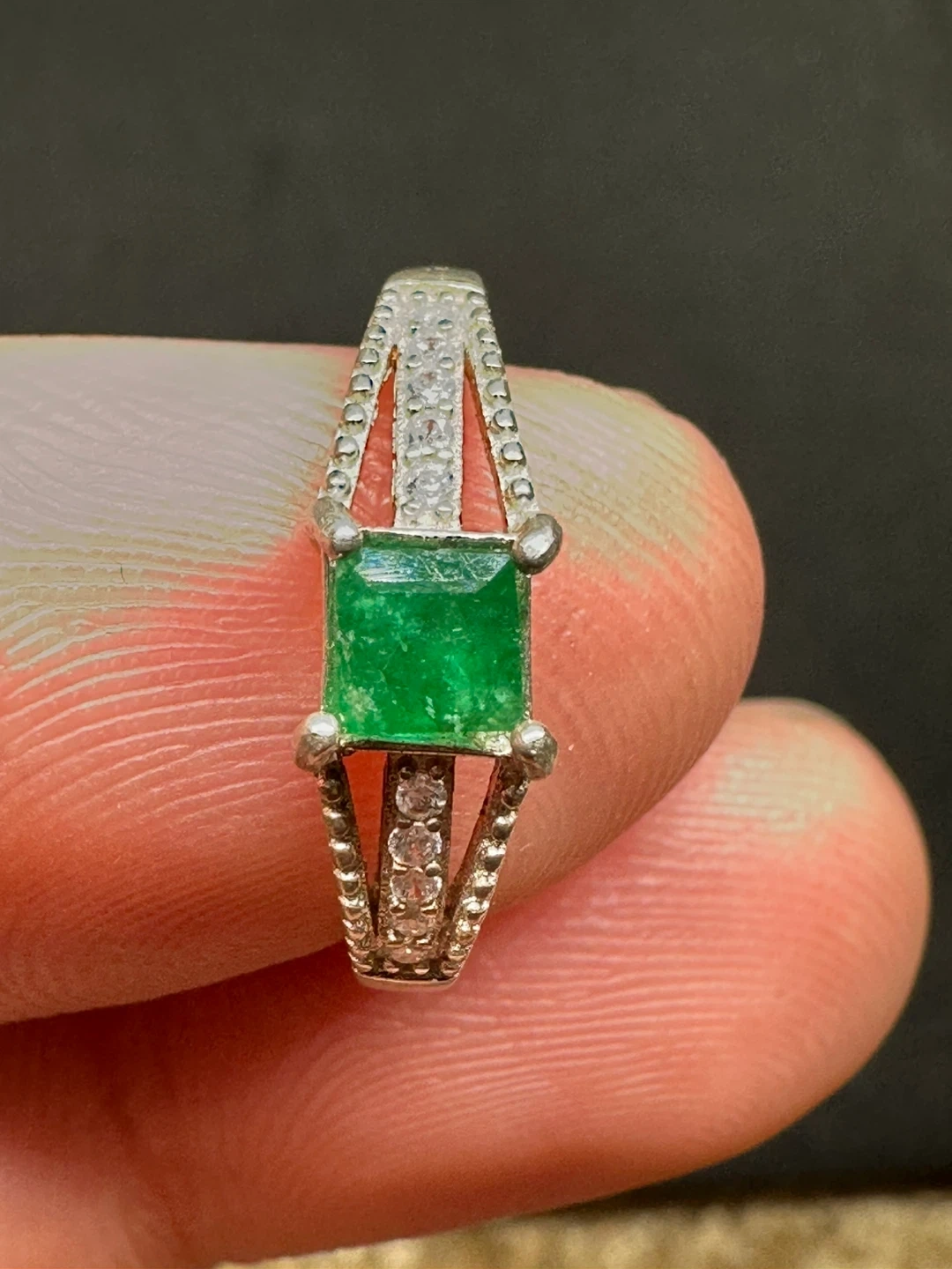 Here's a beautiful ring featuring a square-cut emerald and small zirconia set in sterling silver! The ring is marked with '925', indicating the silver content. It appears to be around a size 5.5-6
