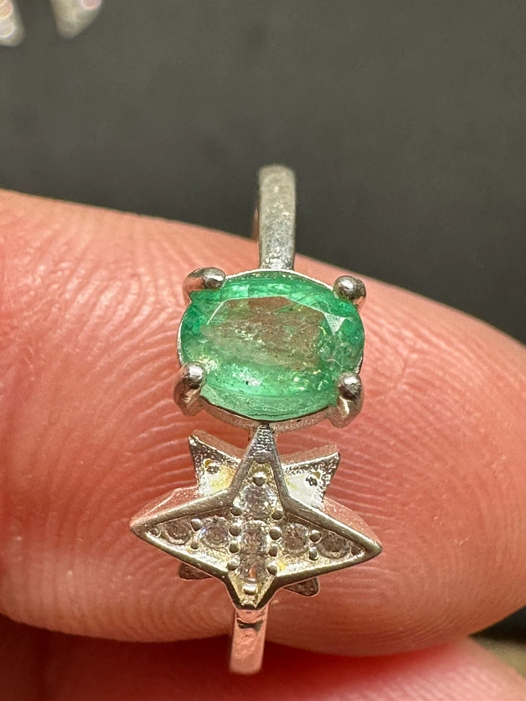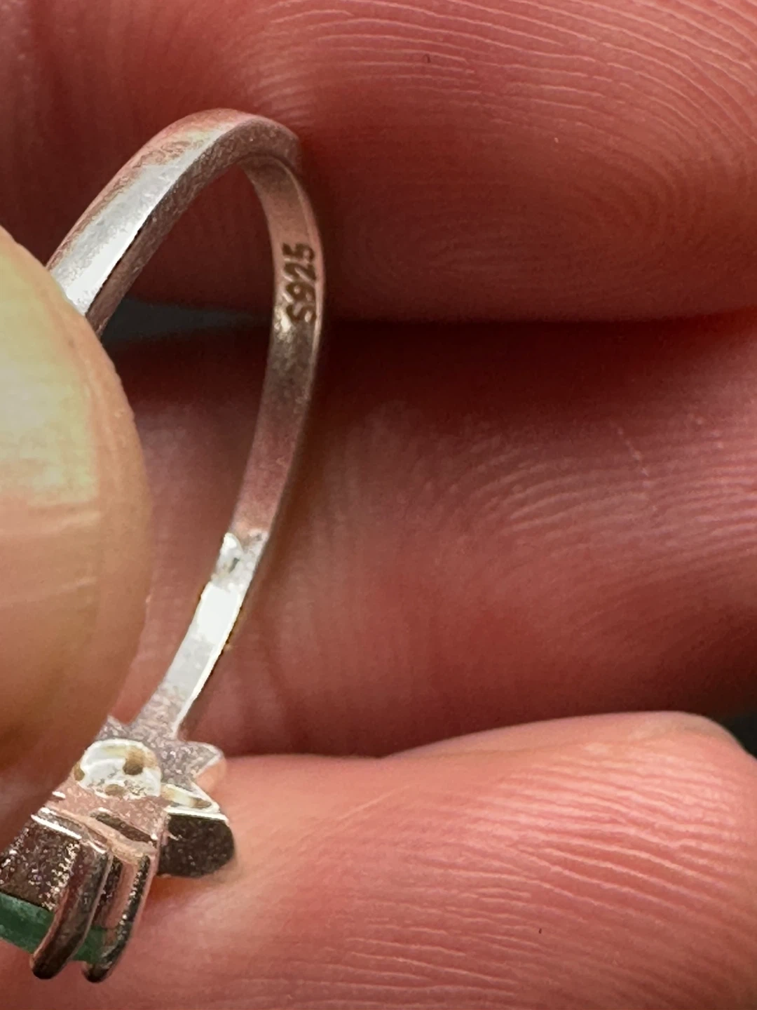 62This is a beautiful sterling silver ring featuring an emerald stone and white zirconia stones accents. The band is stamped with 'S925' indicating its sterling silver composition. It's a size is approximately 8.5-9.5 and in great condition!