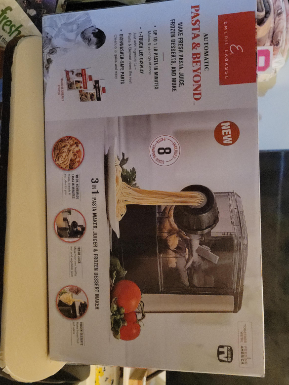 I'm selling a brand new Emeril Lagasse Automatic Pasta & Beyond maker! It's a 3-in-1 pasta maker, juicer, and frozen dessert maker. It can make up to 1 lb of pasta in minutes and makes 8 servings at once. It also features a 1-touch LED display and dishwasher-safe parts for easy cleanup