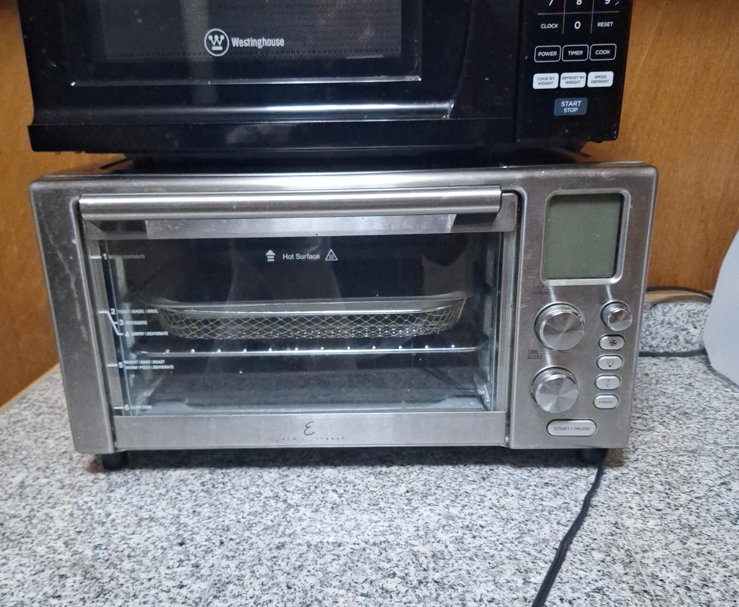 Emeril Lagasse Power Air Fryer Oven. It has settings for toast, bagel, roast, air fry/dehydrate, bake/roast, and warm up/pizza/dehydrate. It also has a hot surface warning.