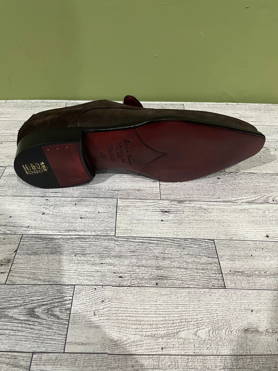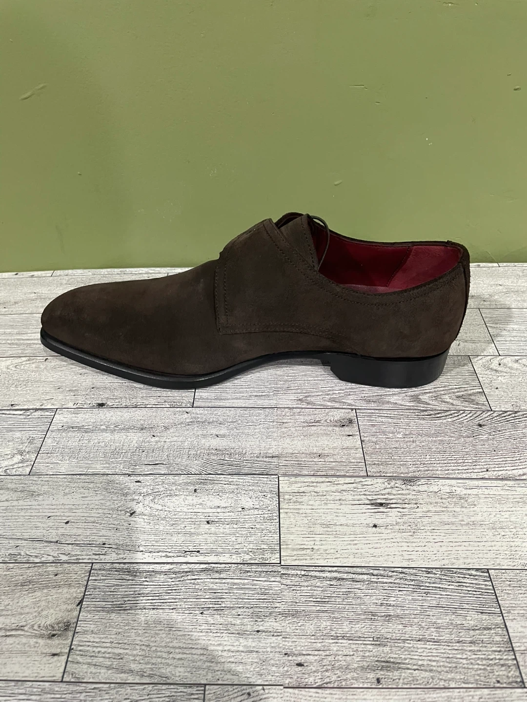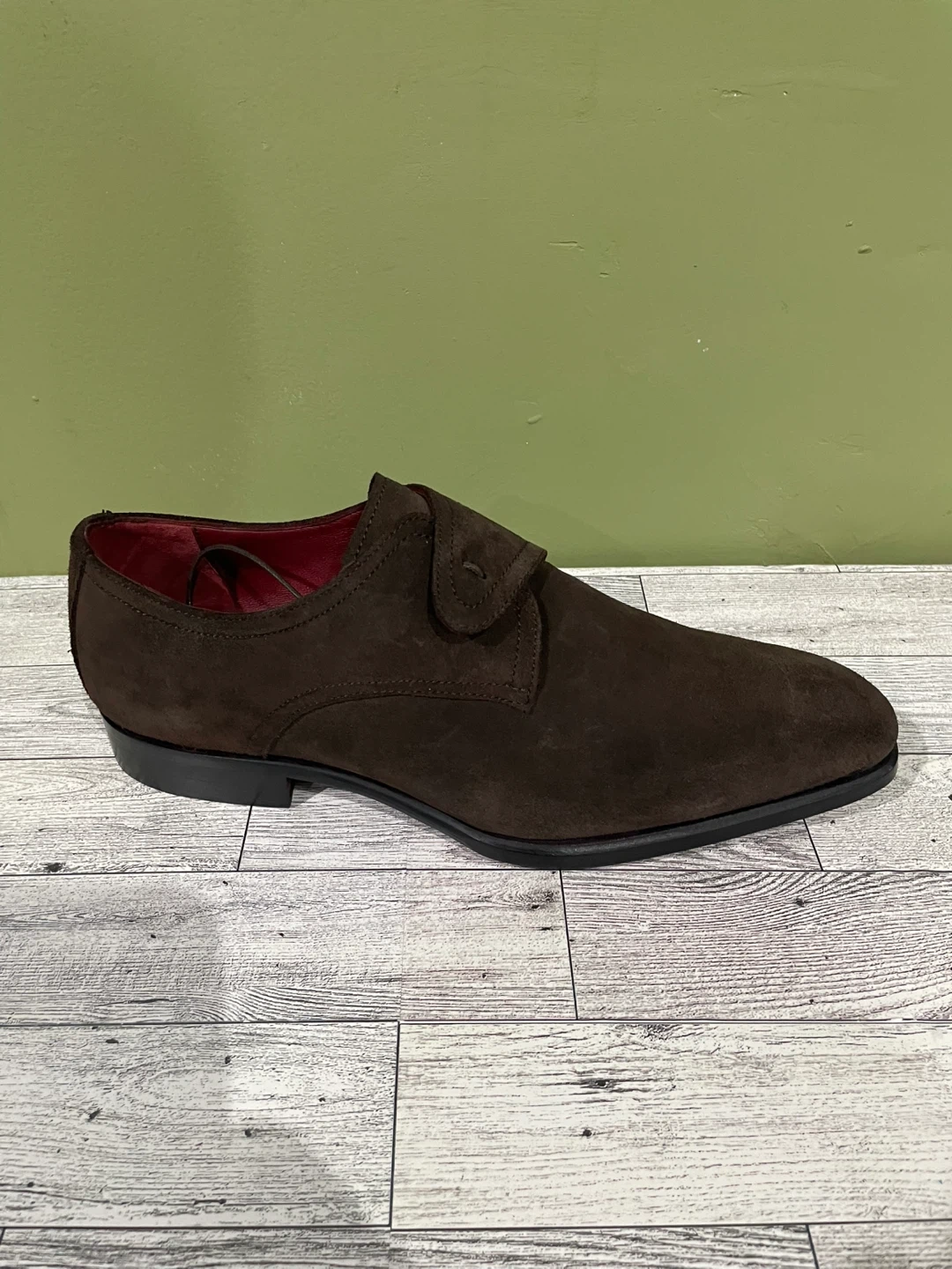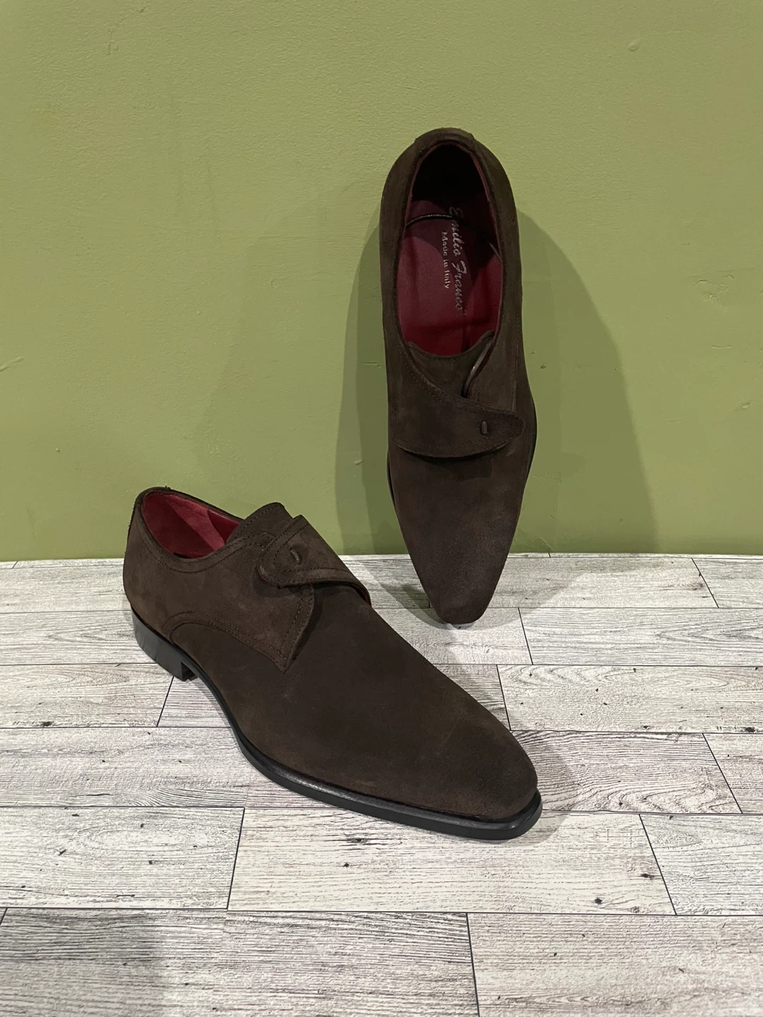 New in box made in Italy Selling a pair of dress shoes These are made of beautiful brown suede leather and have a unique design with a buttoned strap. The shoes are perfect for any formal occasion!