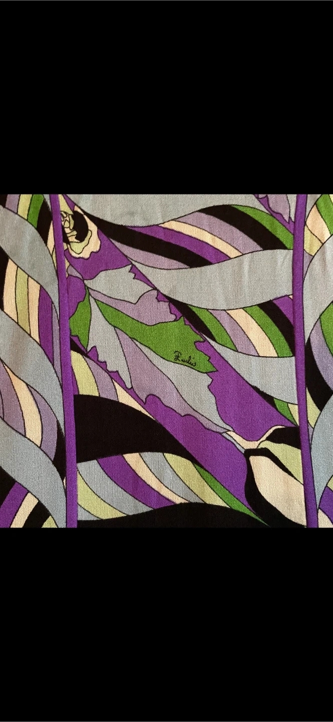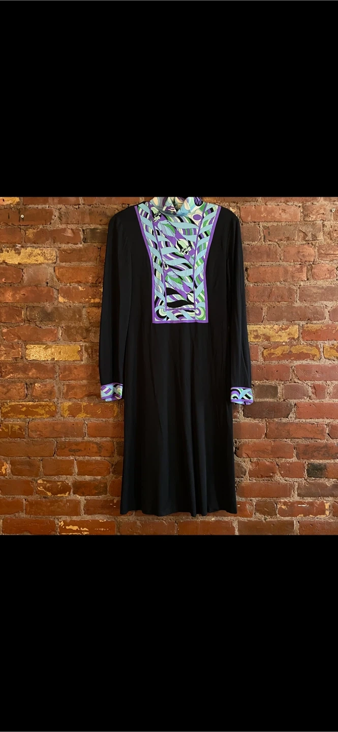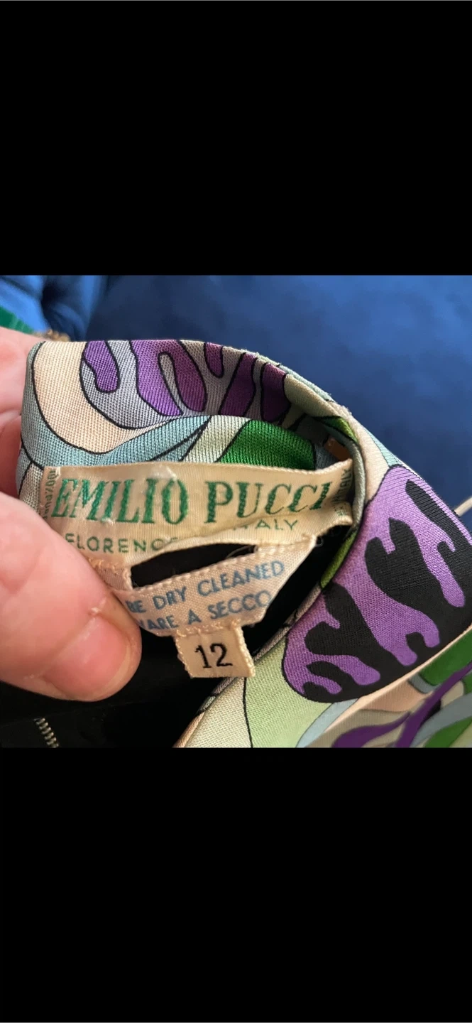 82Selling an authentic vintage Emilio Pucci dress in size small 2-4 women’s in modern day sizing. It features a unique and colorful pale blue lilac and green design with black base . The dress has been dry cleaned, ensuring it's ready to wear! Perfect working zipper. Rare piece.