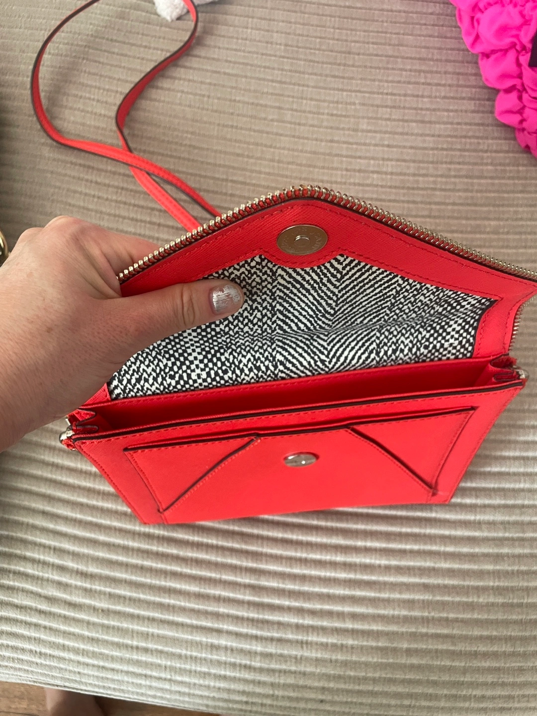 Selling a cute Rebecca Minkoff crossbody bag - new! It's a vibrant red color and has a unique envelope design with a zipper accent. Perfect for adding a pop of color to your outfit and carrying essentials Emma Fox vintage leather bag- used but in a great shape!