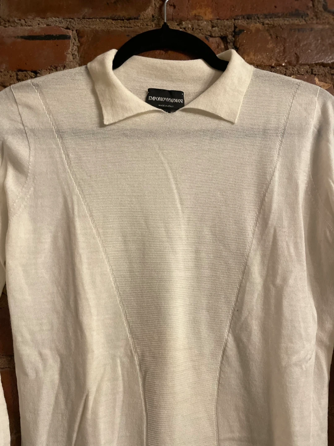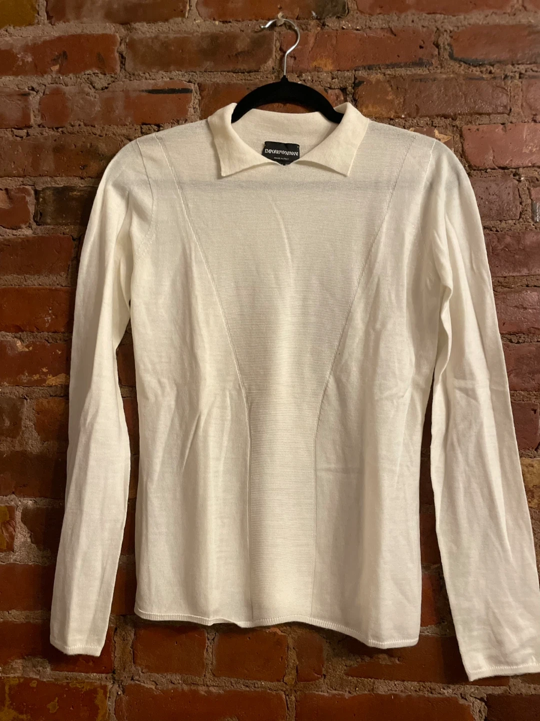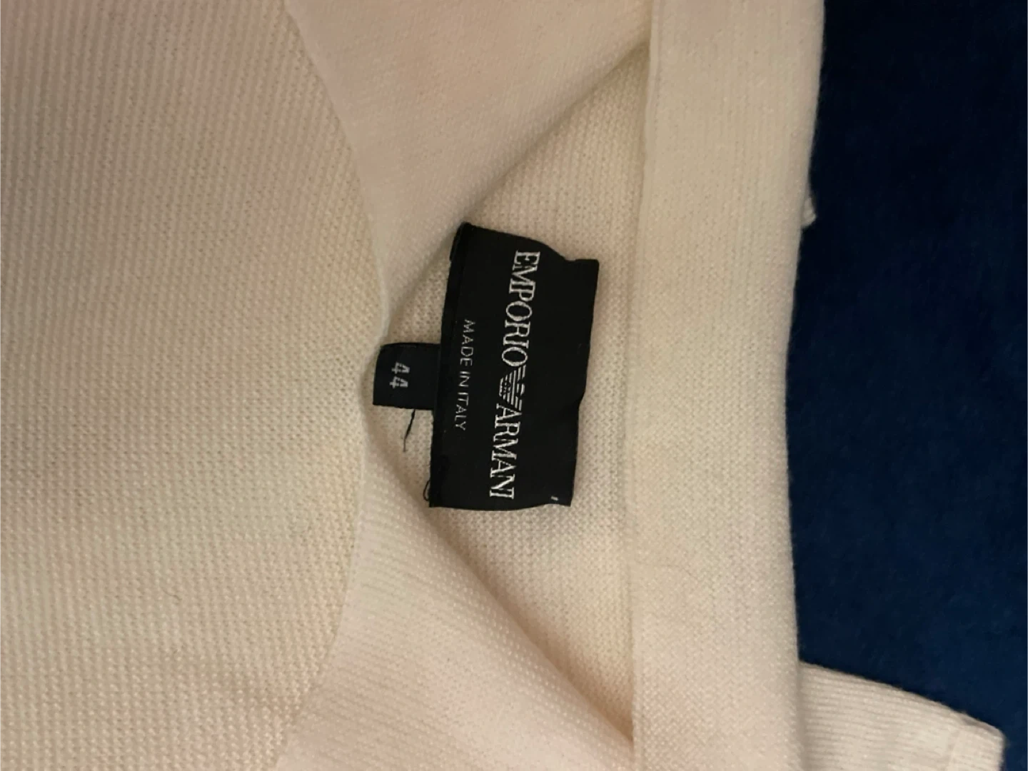 82Selling a gently used Emporio Armani knit top in a beautiful white color! The size is 44. It's made in Italy and features a classic design. Perfect for adding a touch of elegance to your wardrobe