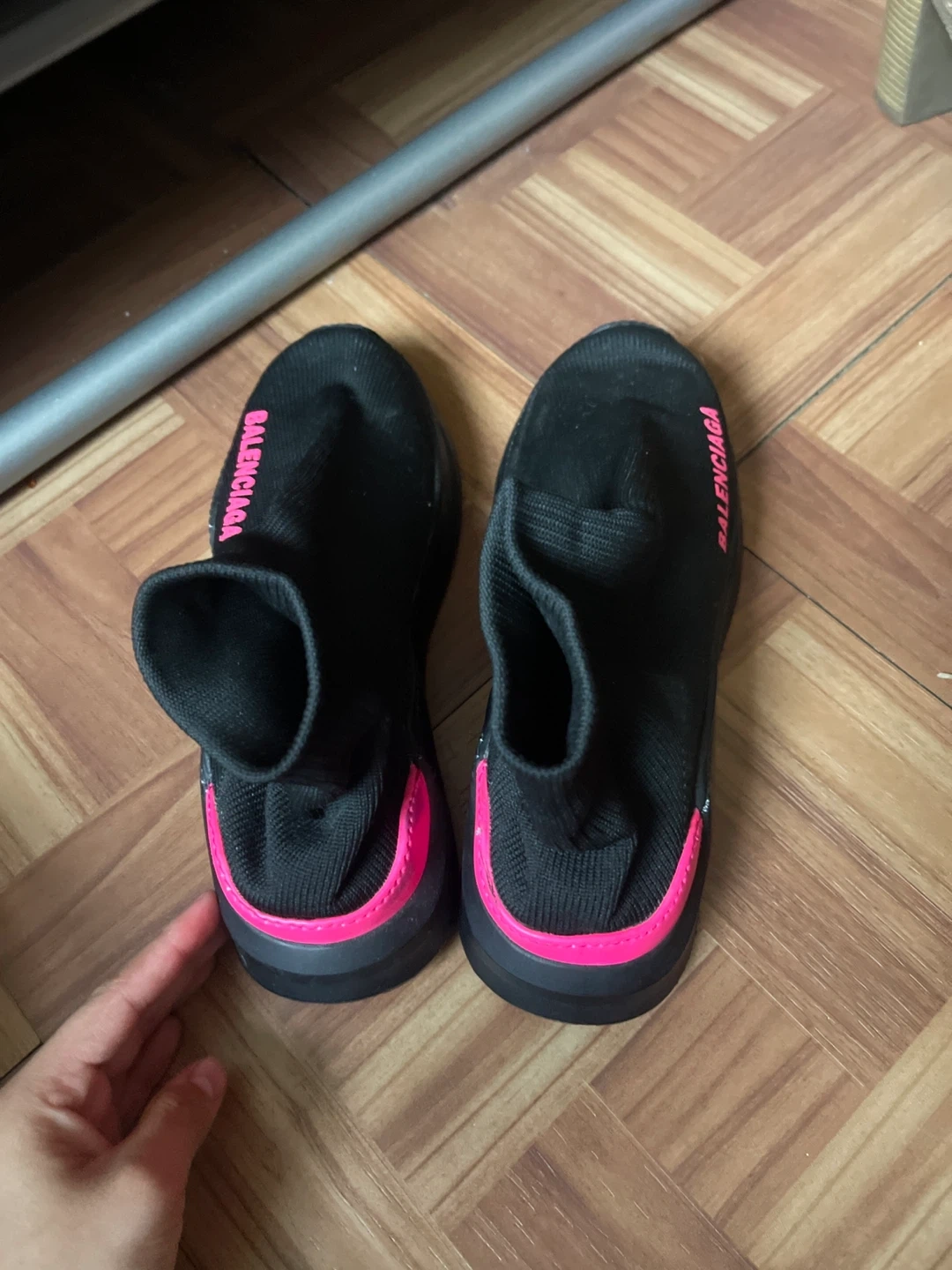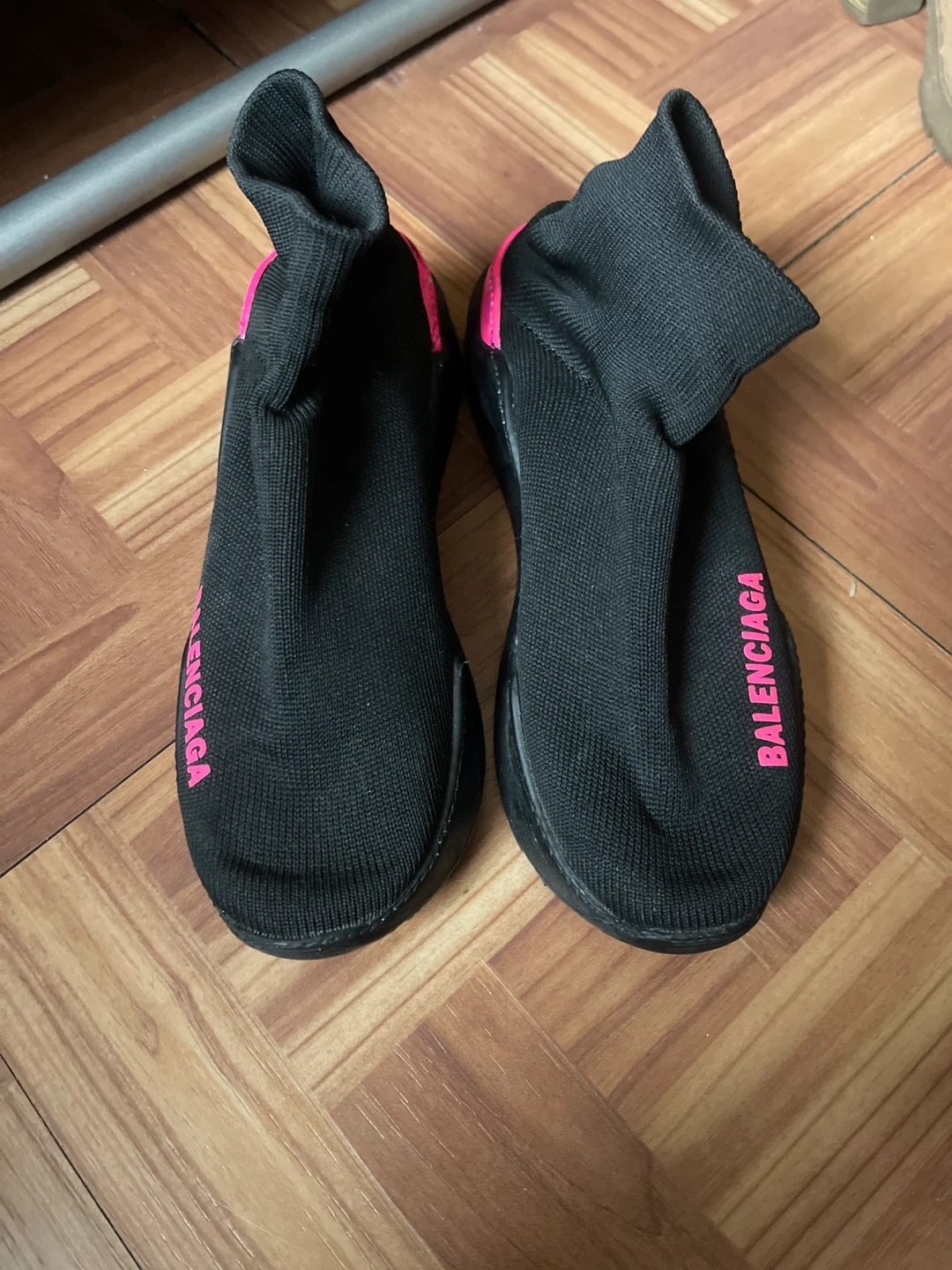 Balenciaga sock sneakers in black with pink accents. Textile upper and synthetic sole. Slip-on style. These are stylish and comfortable.