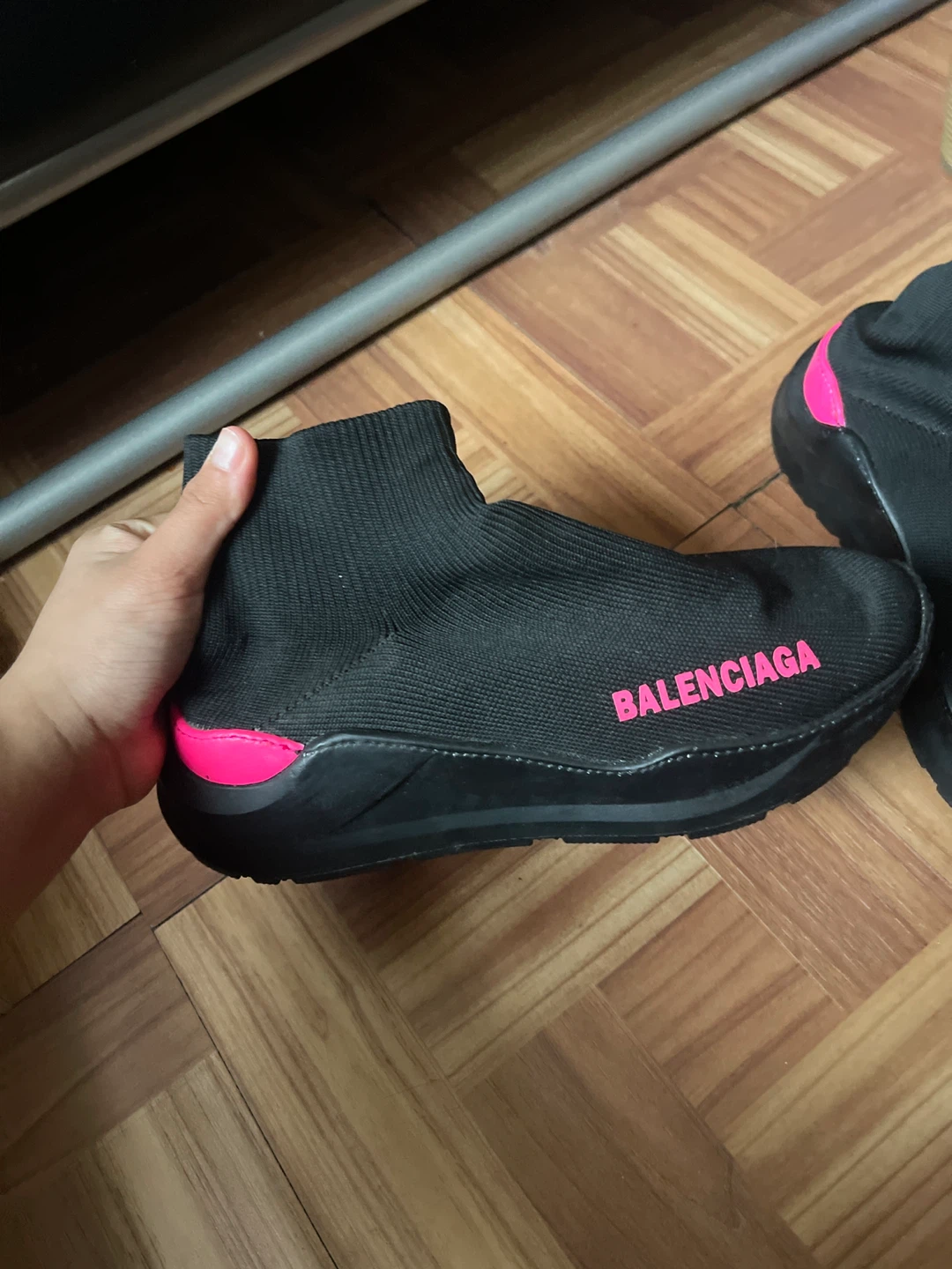 Balenciaga sock sneakers in black with pink accents. Textile upper and synthetic sole. Slip-on style. These are stylish and comfortable.