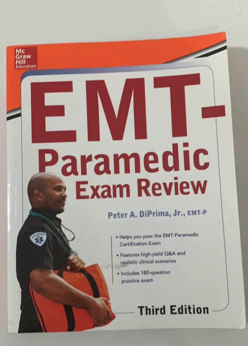 Selling the EMT-Paramedic Exam Review book by Peter A. DiPrima, Jr., EMT-P. It's the Third Edition. The book helps you pass the EMT-Paramedic Certification Exam and features high-yield Q&A and realistic clinical scenarios. It also includes a 180-question practice exam