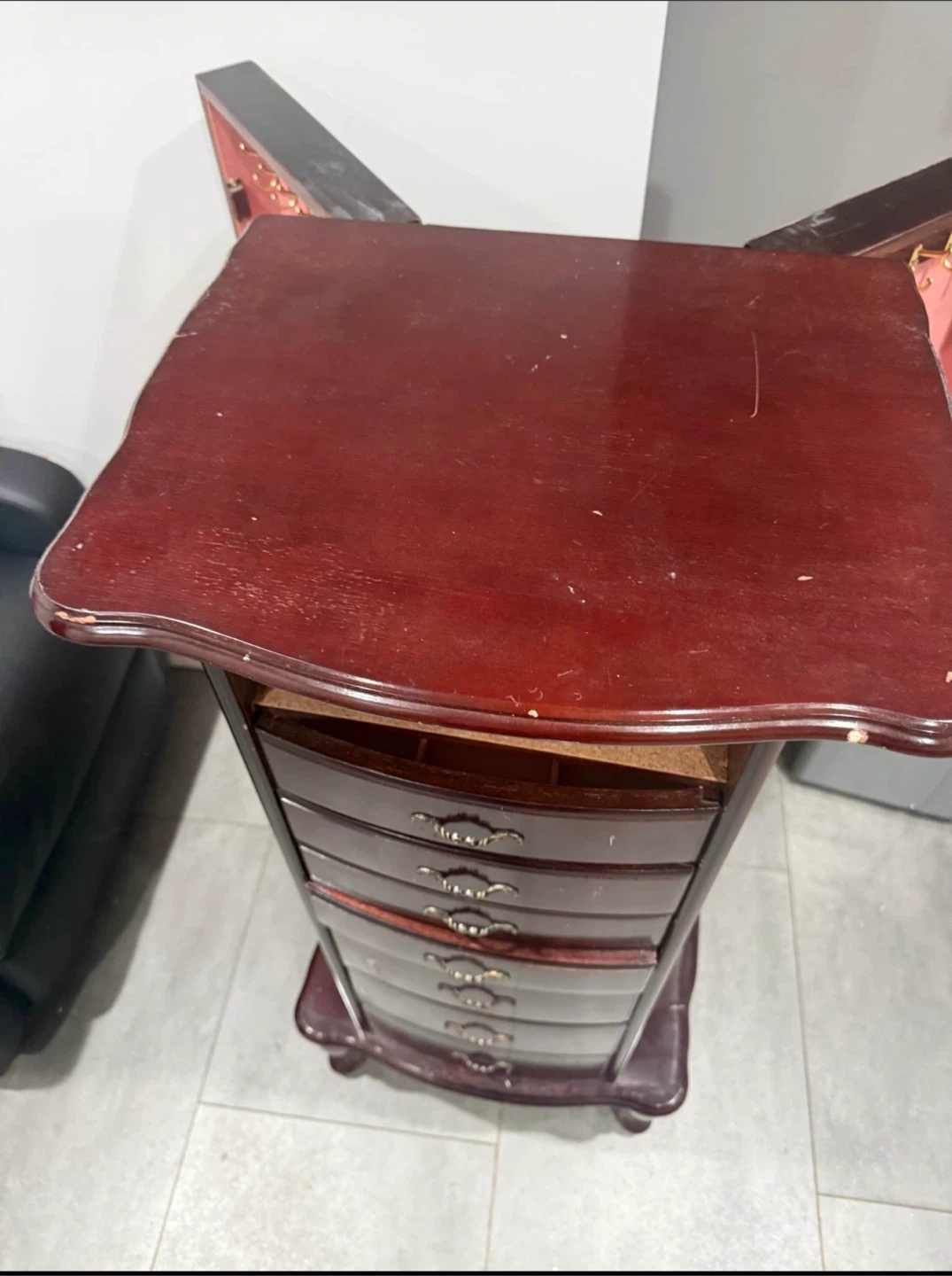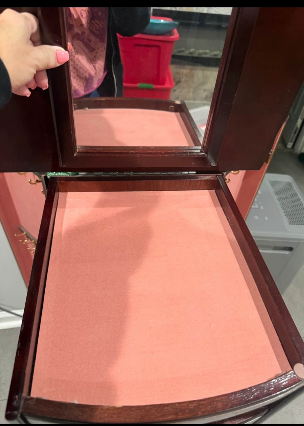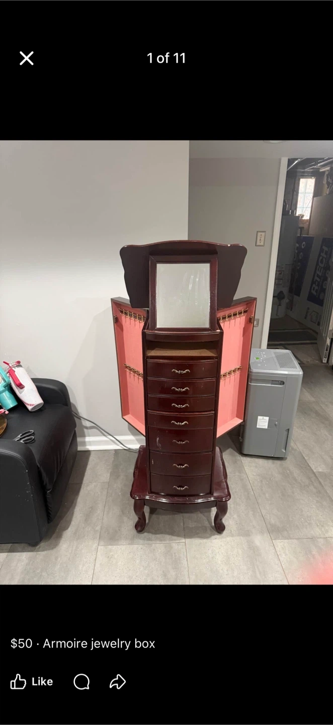 This jewelry armoire is made of dark wood and features a mirror. It has multiple drawers lined with pink fabric for organizing your jewelry. Some drawers have dividers.