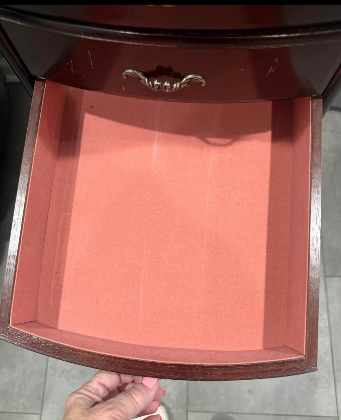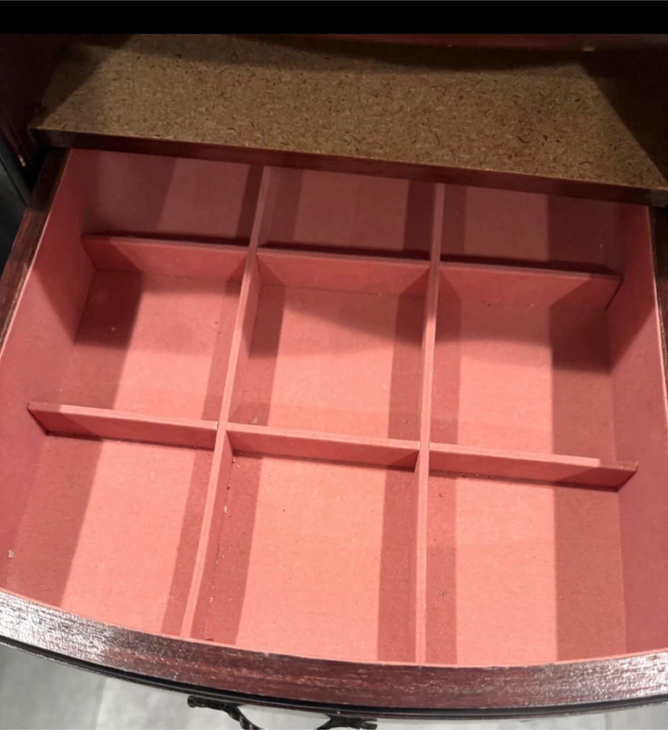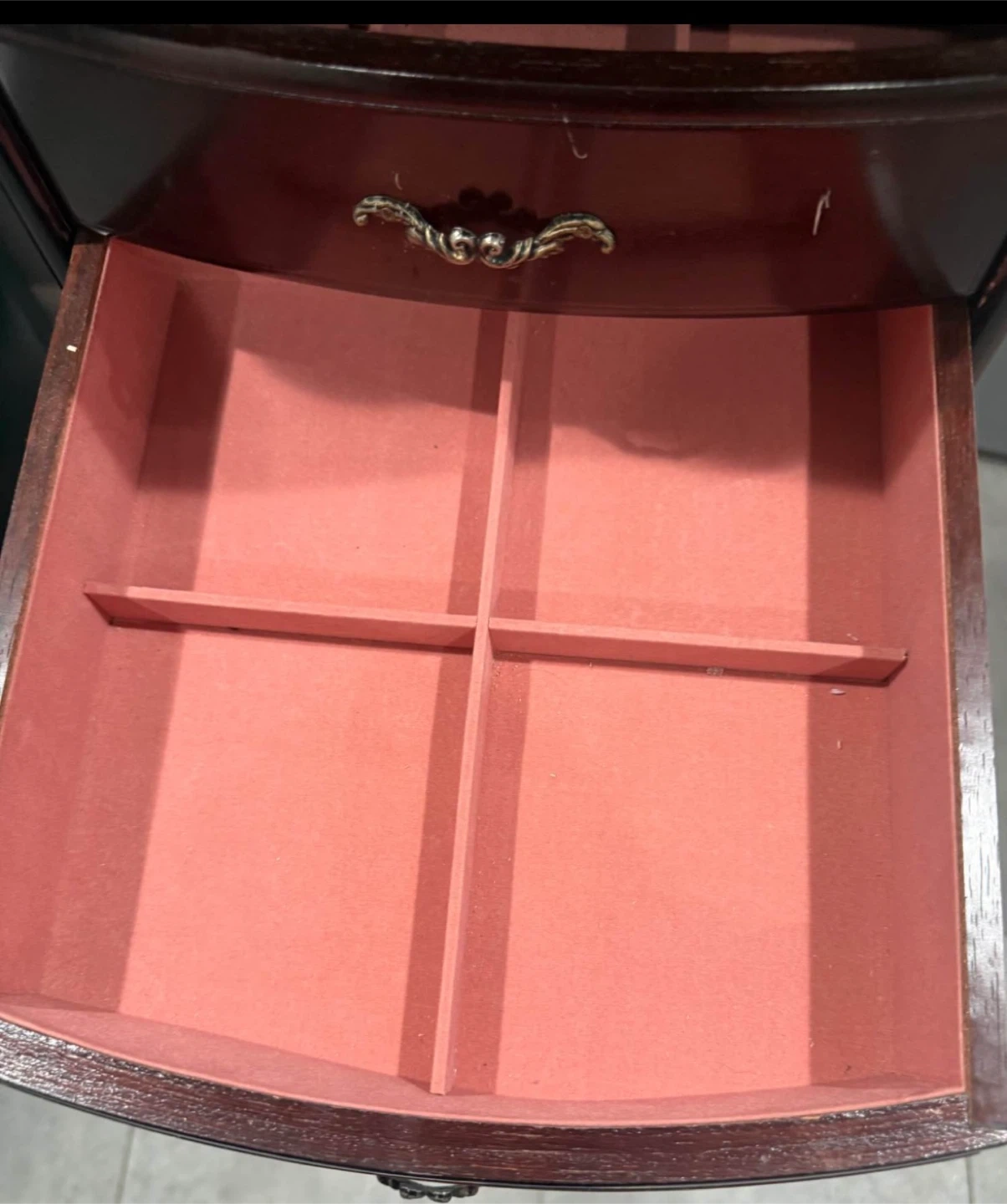 This jewelry armoire is made of dark wood and features a mirror. It has multiple drawers lined with pink fabric for organizing your jewelry. Some drawers have dividers.