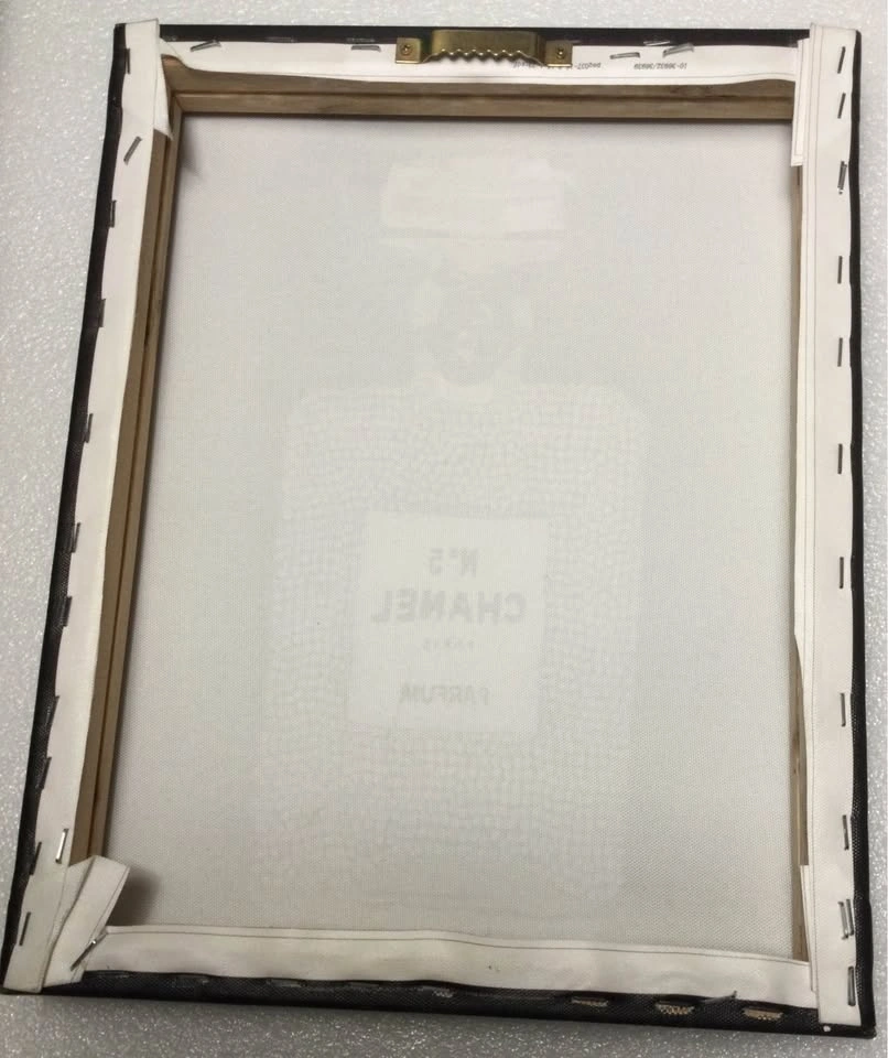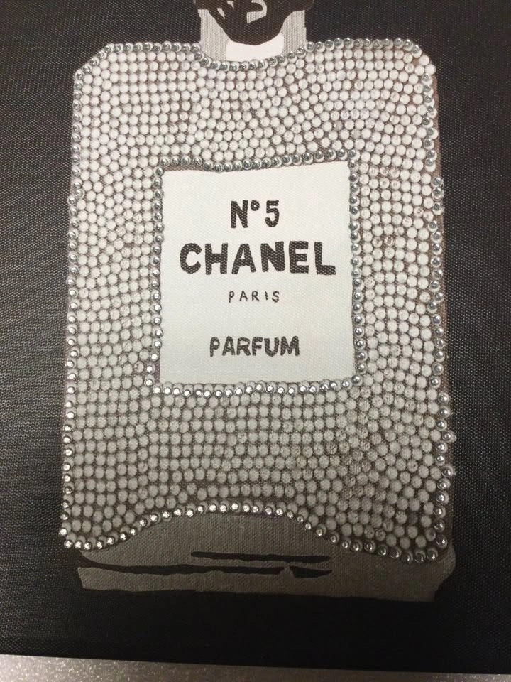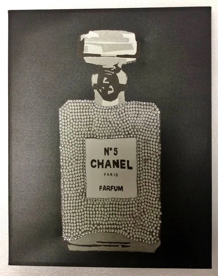 Glam canvas art featuring a Chanel N°5 perfume bottle design with lots of sparkly rhinestones on a black background. Size is 11x14 inches. Comes with a hanger on the back, ready to display. Cash only, public meetup in Manhattan / Hell's Kitchen.