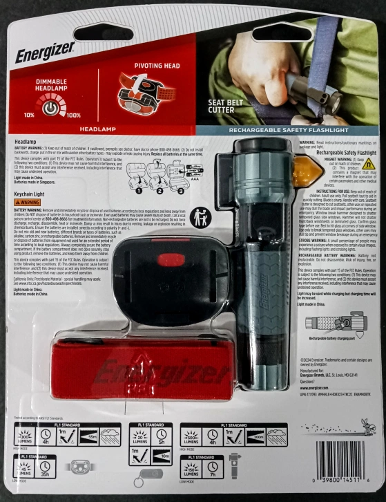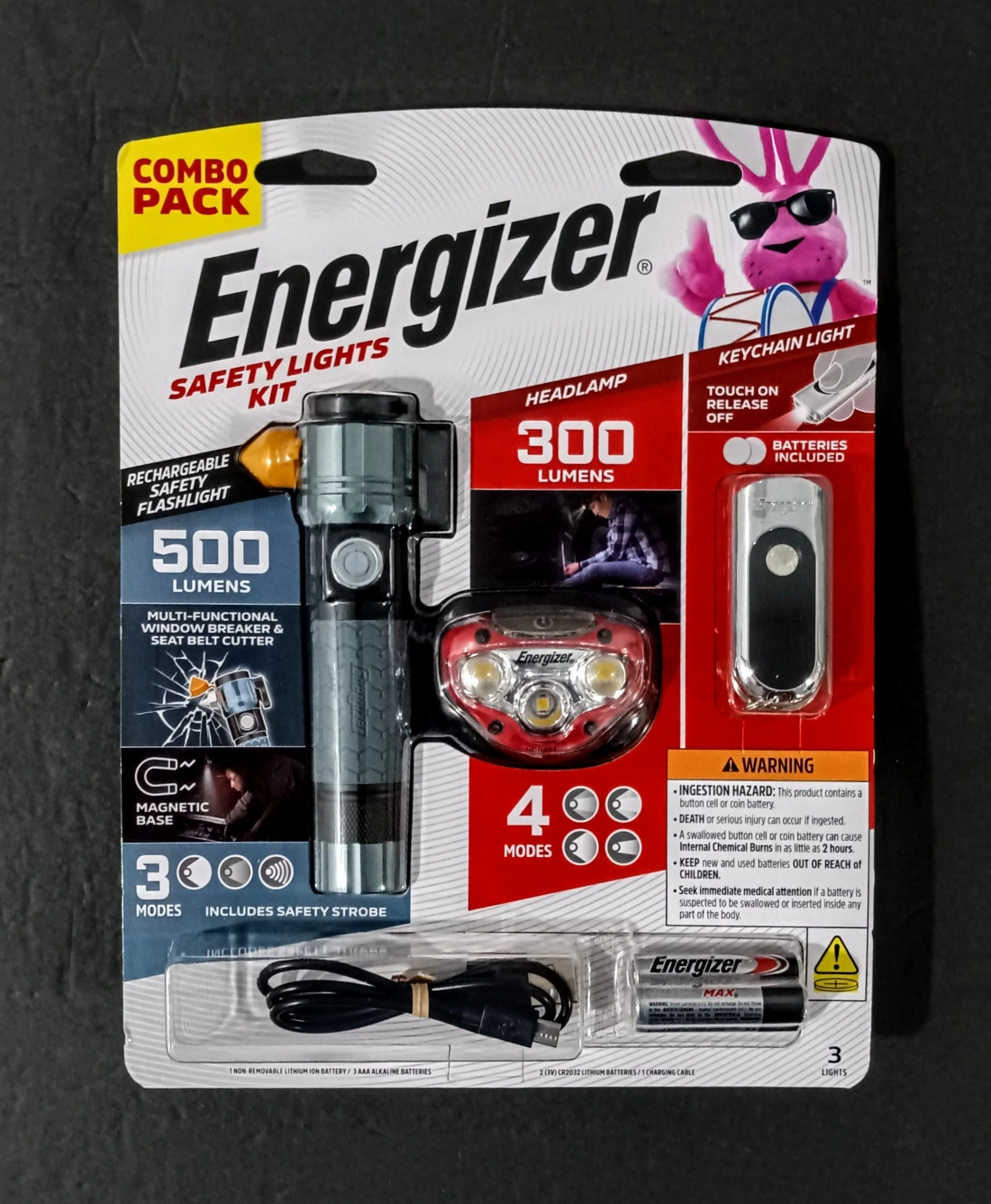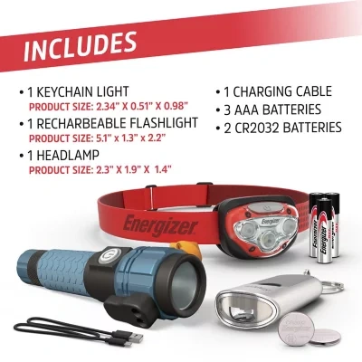Energizer 3-Piece Safety Light Set Is Brand New $20 Firm. Highlights: *Combo emergency light pack includes three types of Energizer safety lights *One Energizer Rechargeable Safety Flashlight with micro-USB charging cord *One Energizer Vision HS LED Headlamp powered by 3 AAA batteries *One Energizer Touch Tech Keychain Flashlight with 2 CR2032 batteries
