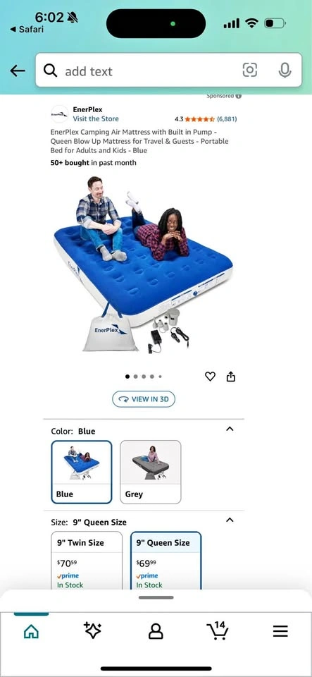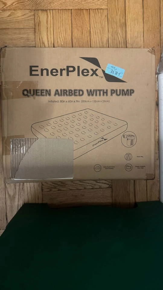 EnerPlex camping air mattress. - Brand new in box, never used - Queen size (80” x 60” x 9”) - Blue top with grey base - Electric pump included - Coil beam construction for support and comfort - Durable, puncture-resistant PVC with waterproof flocked top - Includes air mattress and carry/storage bag - Great for camping, overnight guests, or road trips Retail is $70.