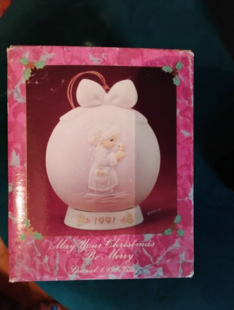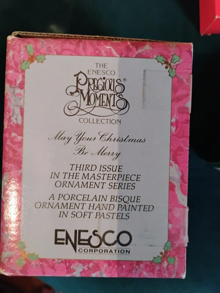 Selling a Precious Moments ornament from Enesco. This is the third issue in the Masterpiece Ornament Series, titled "May Your Christmas Be Merry" and is a special 1991 issue. It's a porcelain bisque ornament hand-painted in soft pastels. Comes with the original box!