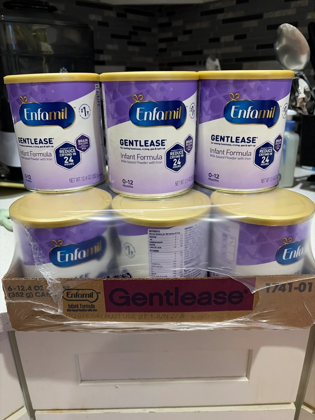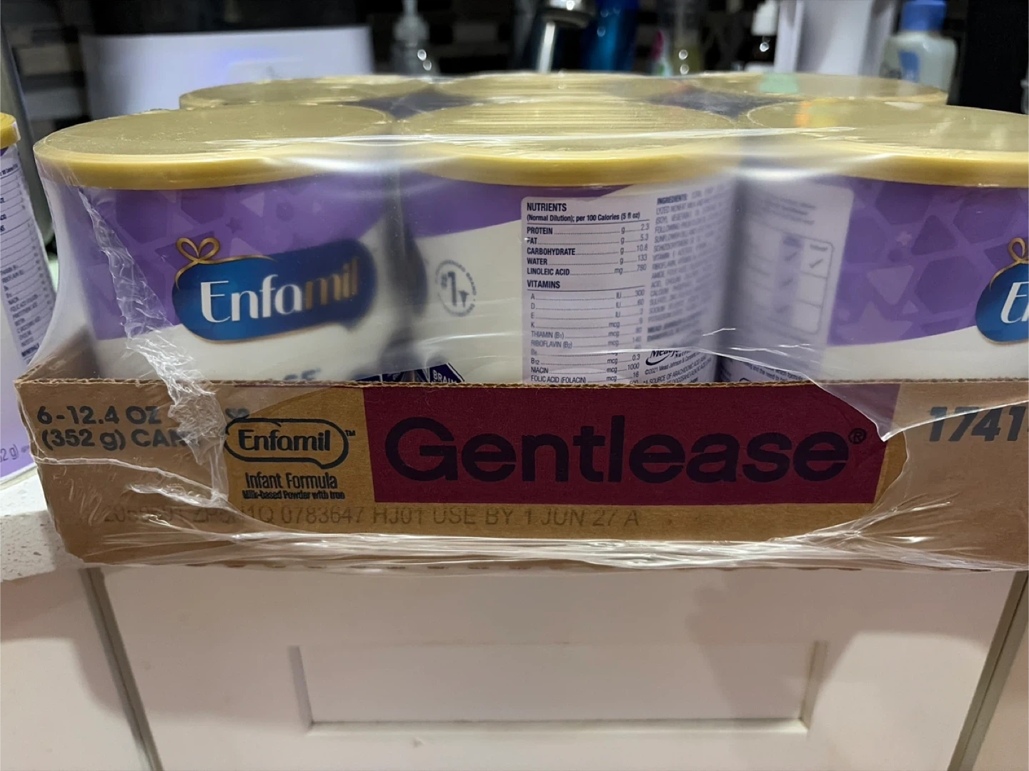 Selling a 9- pack of Enfamil Gentlease Infant Formula. This milk-based powder with iron is designed for infants 0-12 months. Each can contains 12.4 oz (352 g). Expiration date is June 1 2027